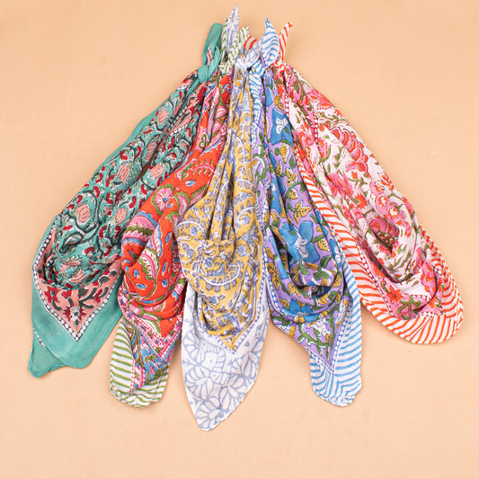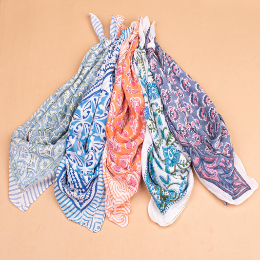 Set of 5 - Block Printed Cotton Bandana, Floral Paisley Scarf, Handmade Wrap For Hair, Neck, Boho Unisex Fashion Accessory, Gift For All