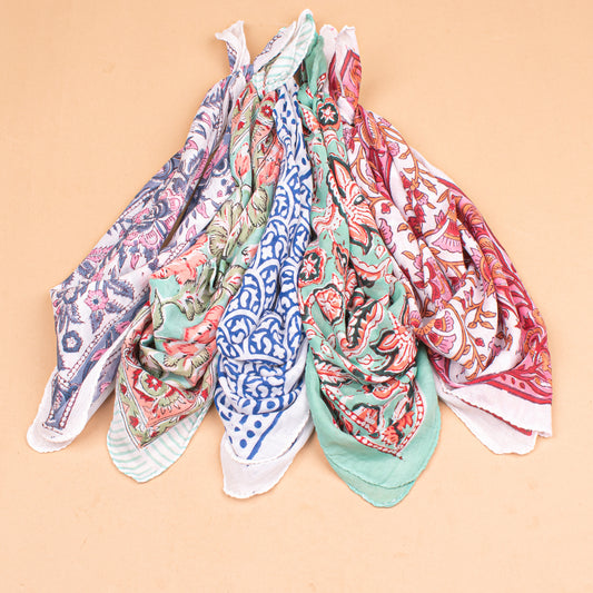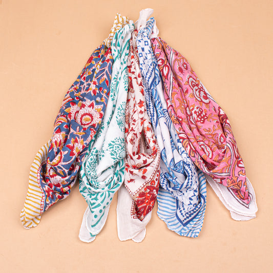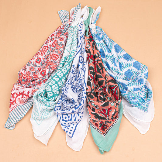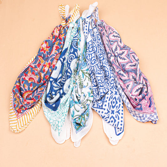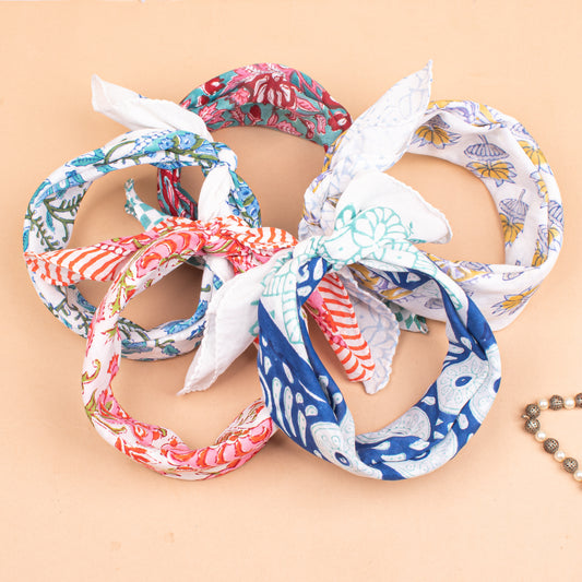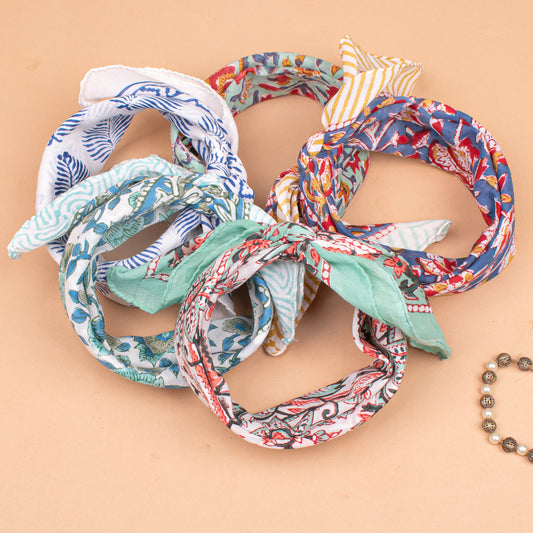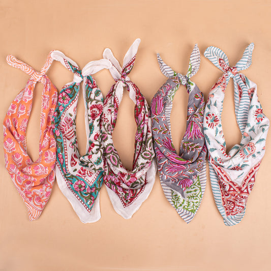 Set of 5 - Block Printed Floral Cotton Bandana, Handmade Organic Scarf, Lightweight Hair Or Neck Wrap, Boho Unisex Fashion Accessory, Unique Gift Idea