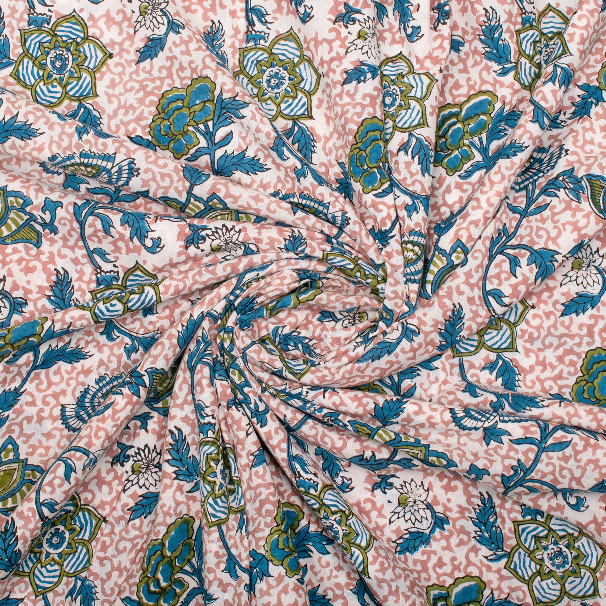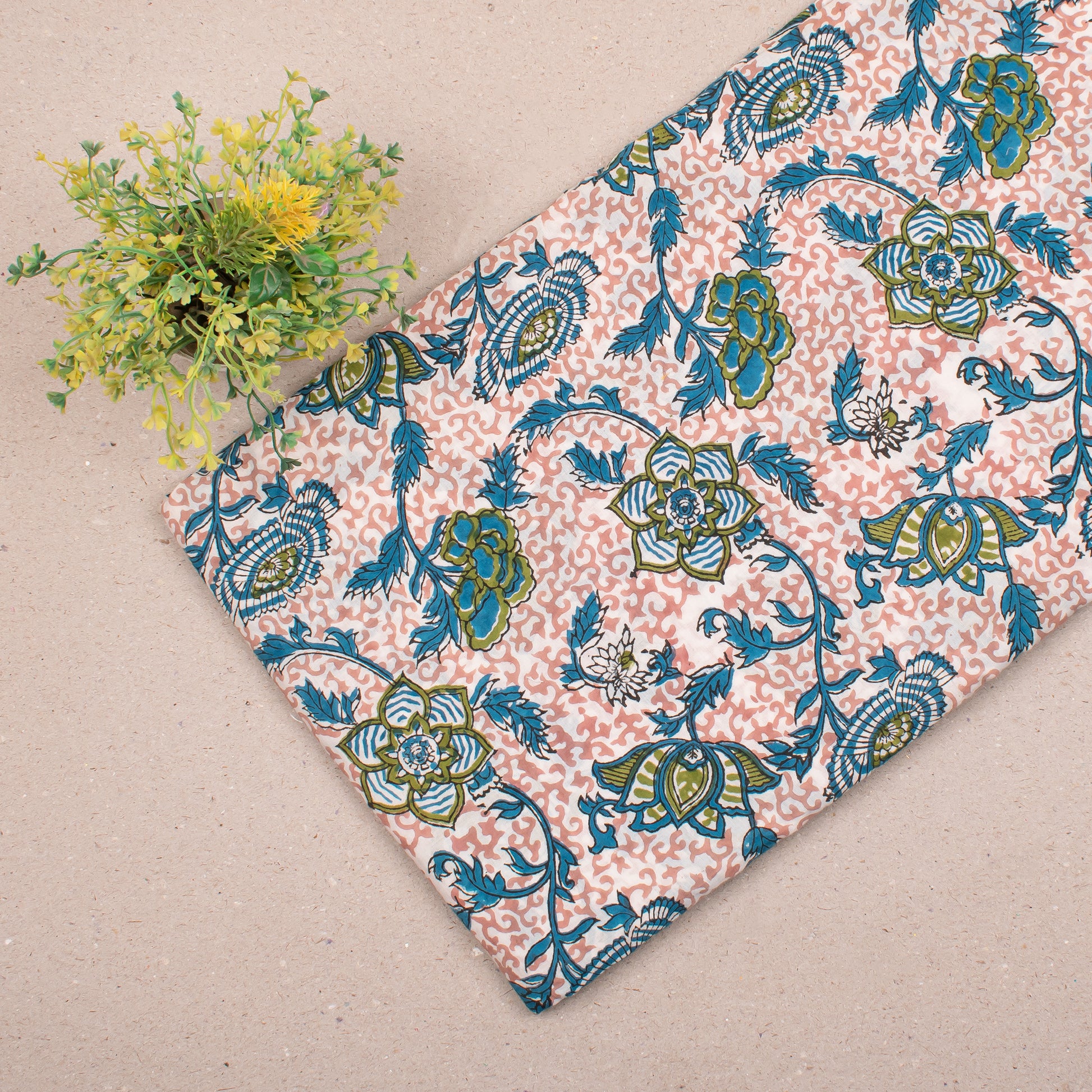 Cotton Fabric With Hand Block Printing, Lightweight Floral Textile For Quilts, Patchwork, Dresses, Scarves, And Decorative Sewing Projects