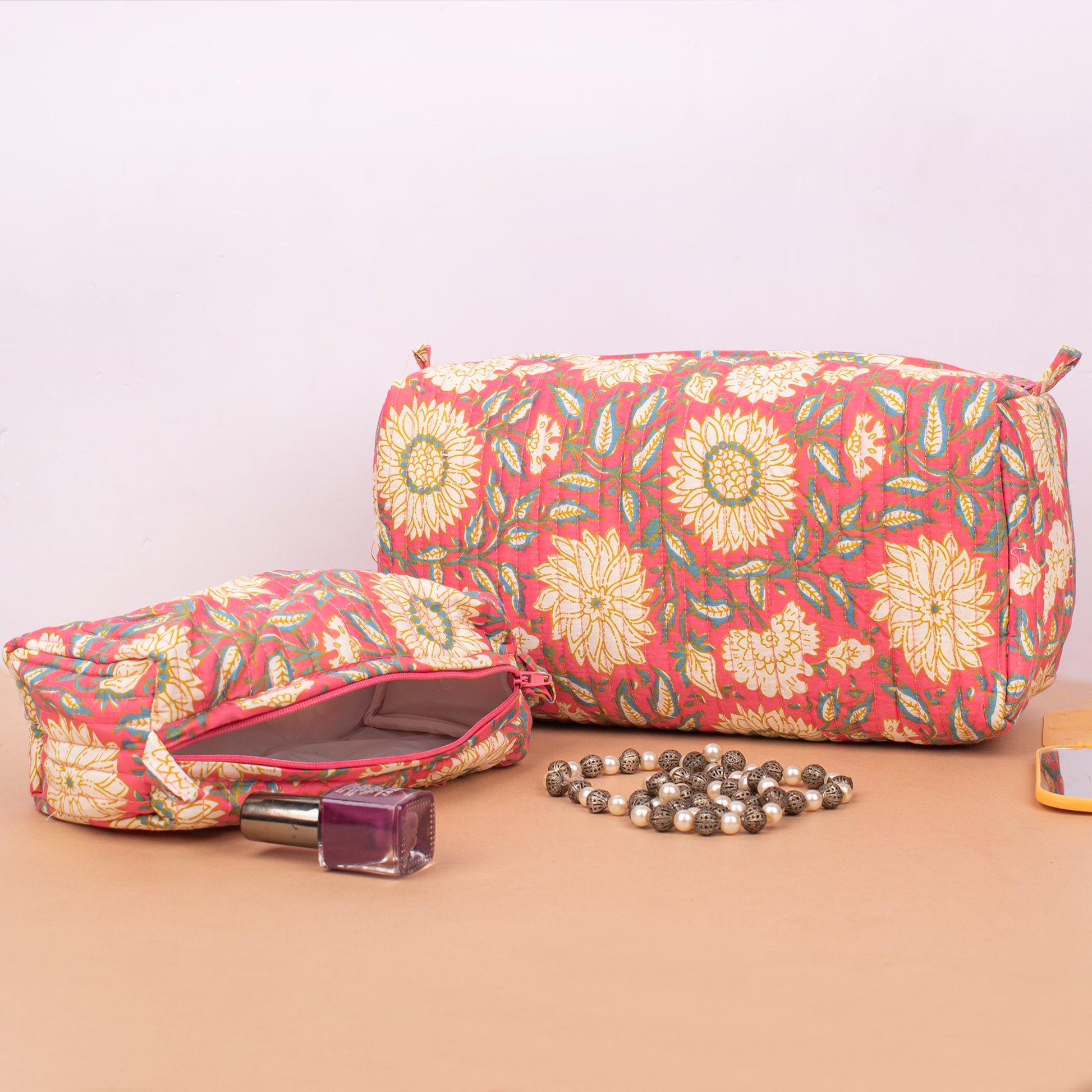 Cotton Quilted Makeup Bag | Handmade Cosmetic Pouch | Toiletry Travel Organizer - Set of 3