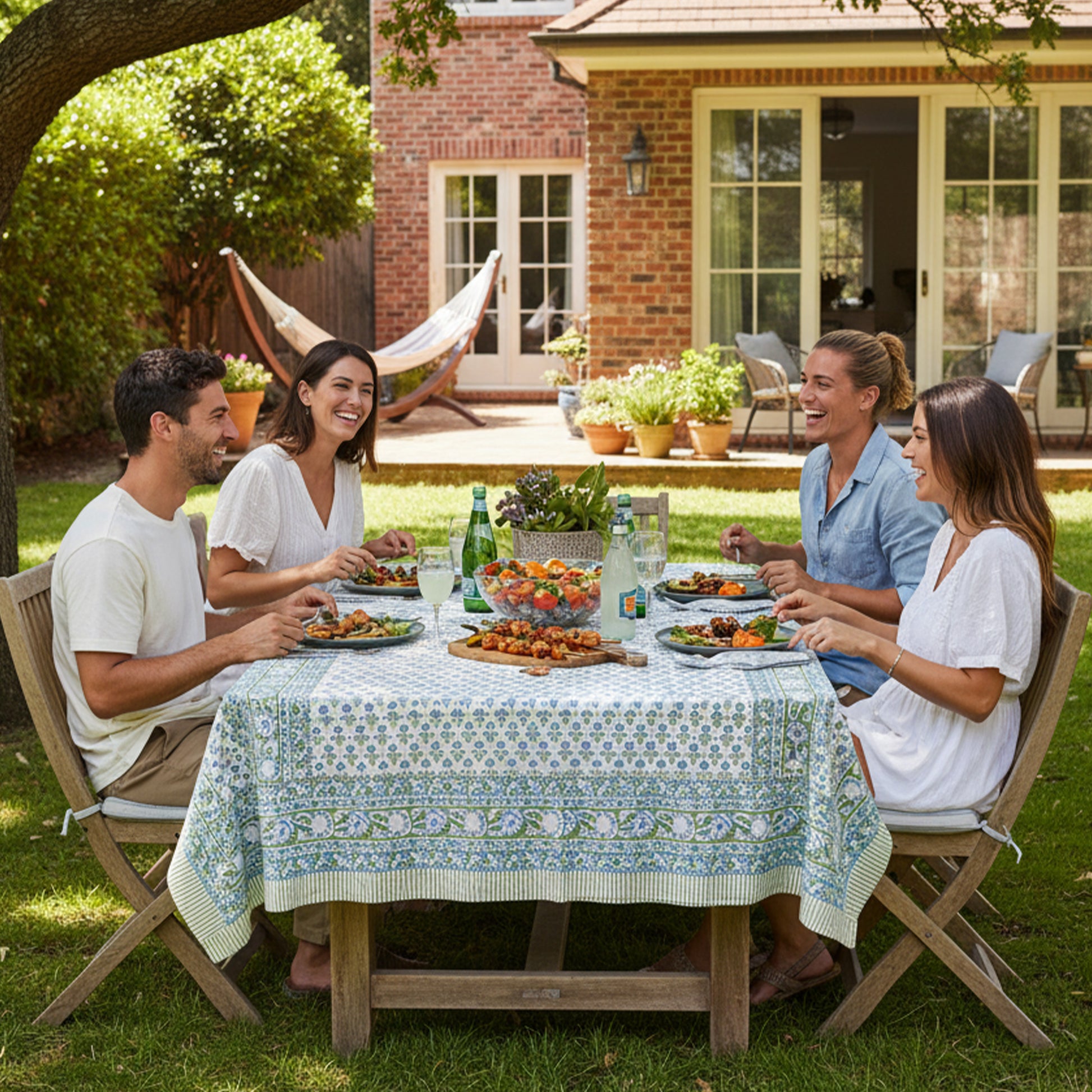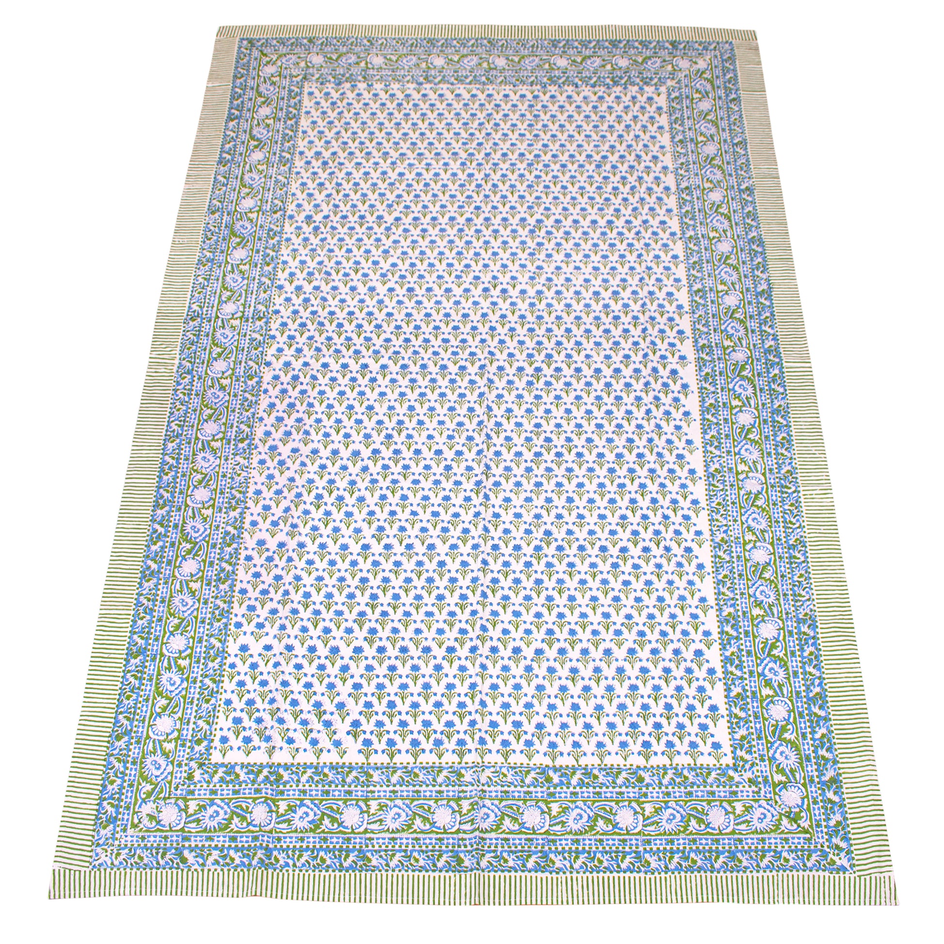Brighten your table with this floral hand block print tablecloth, made from breathable cotton fabric. Its colorful boho-inspired design brings life to casual breakfasts, outdoor picnics, or festive dinners. Handcrafted using traditional printing techniques, this table cover adds artistic flair to your kitchen or dining area.