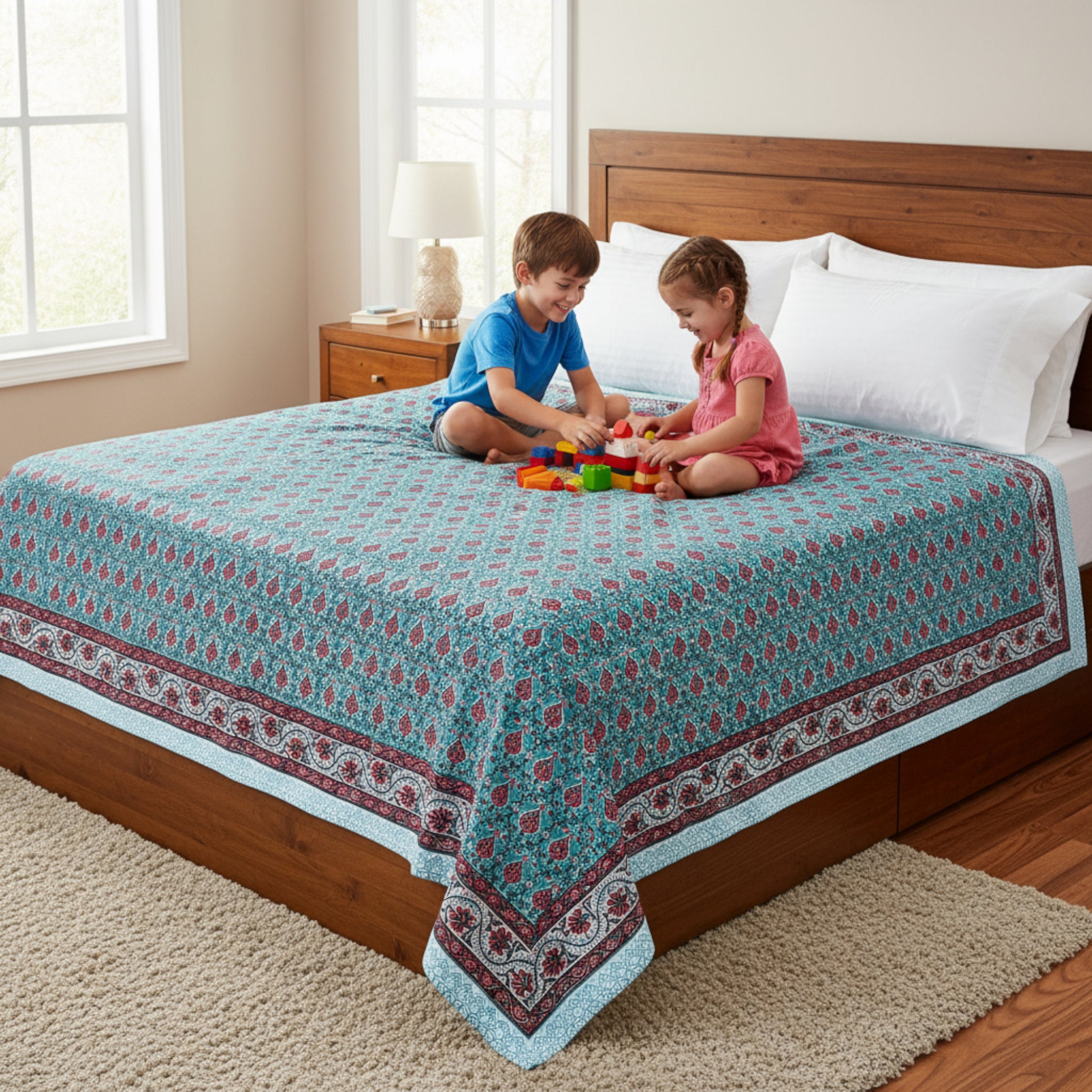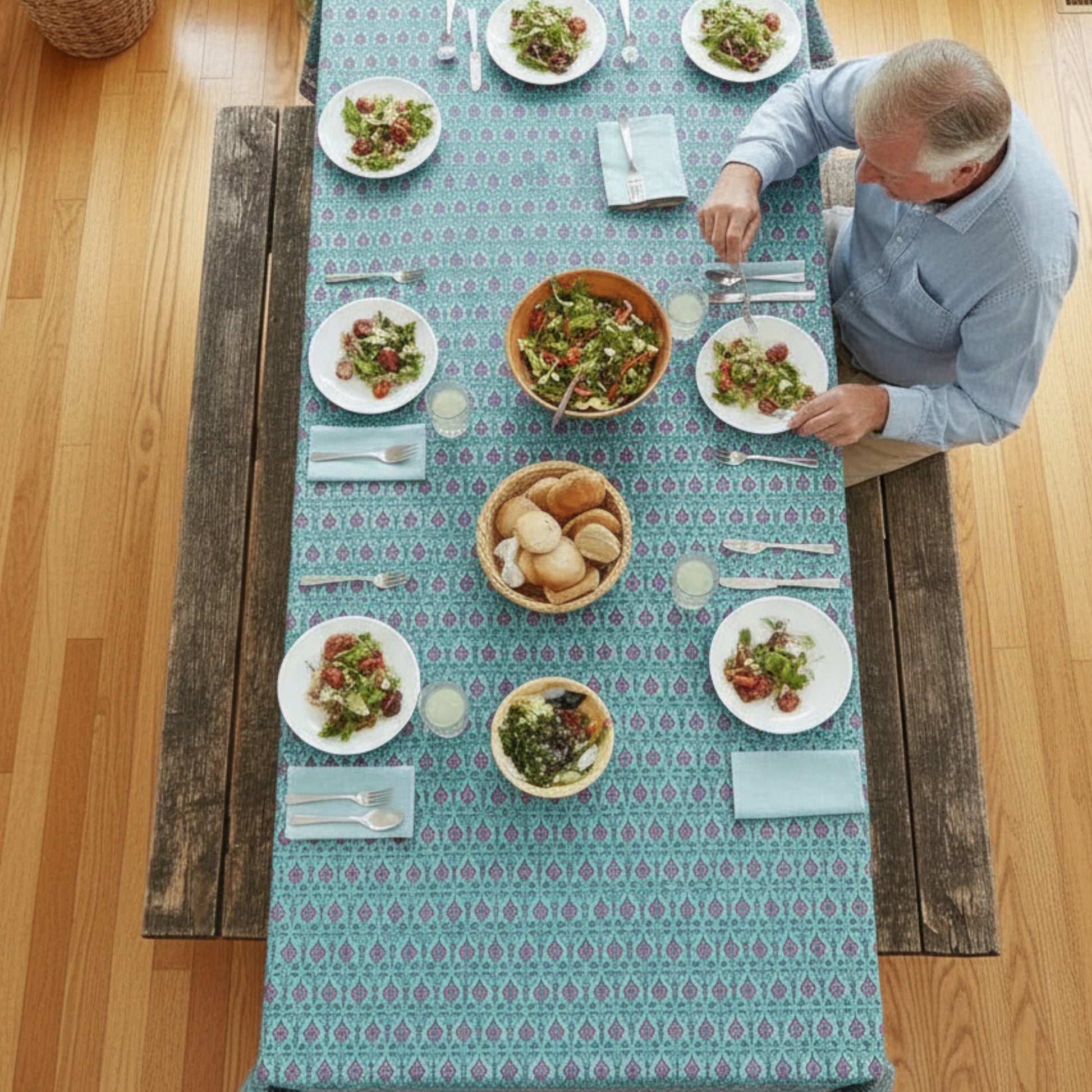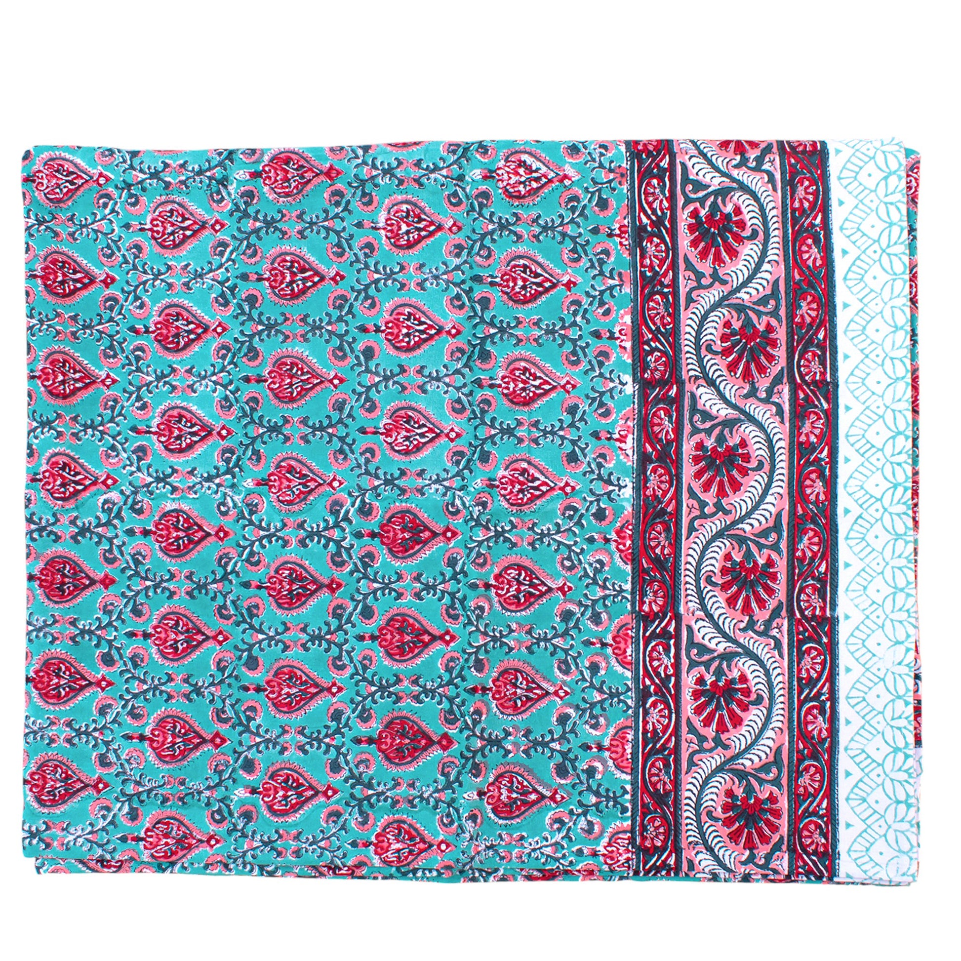 Brighten your table with this floral hand block print tablecloth, made from breathable cotton fabric. Its colorful boho-inspired design brings life to casual breakfasts, outdoor picnics, or festive dinners. Handcrafted using traditional printing techniques, this table cover adds artistic flair to your kitchen or dining area.