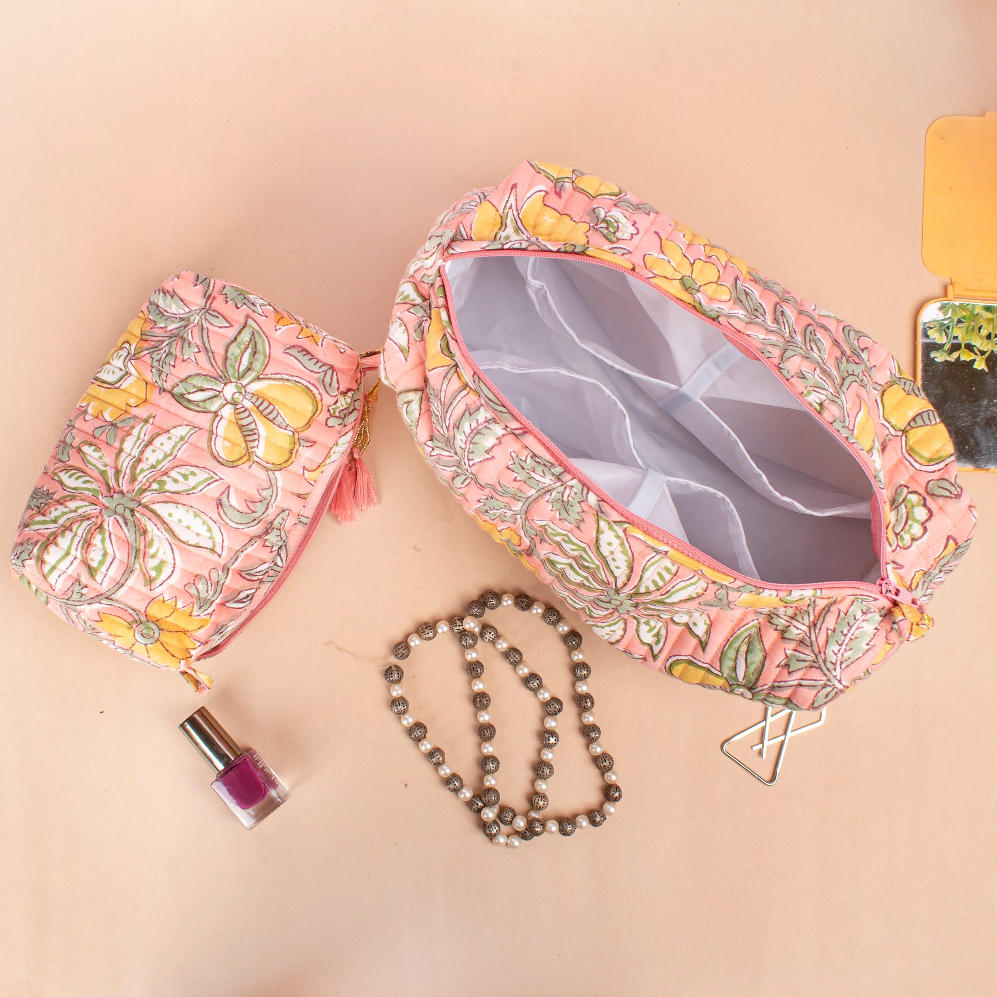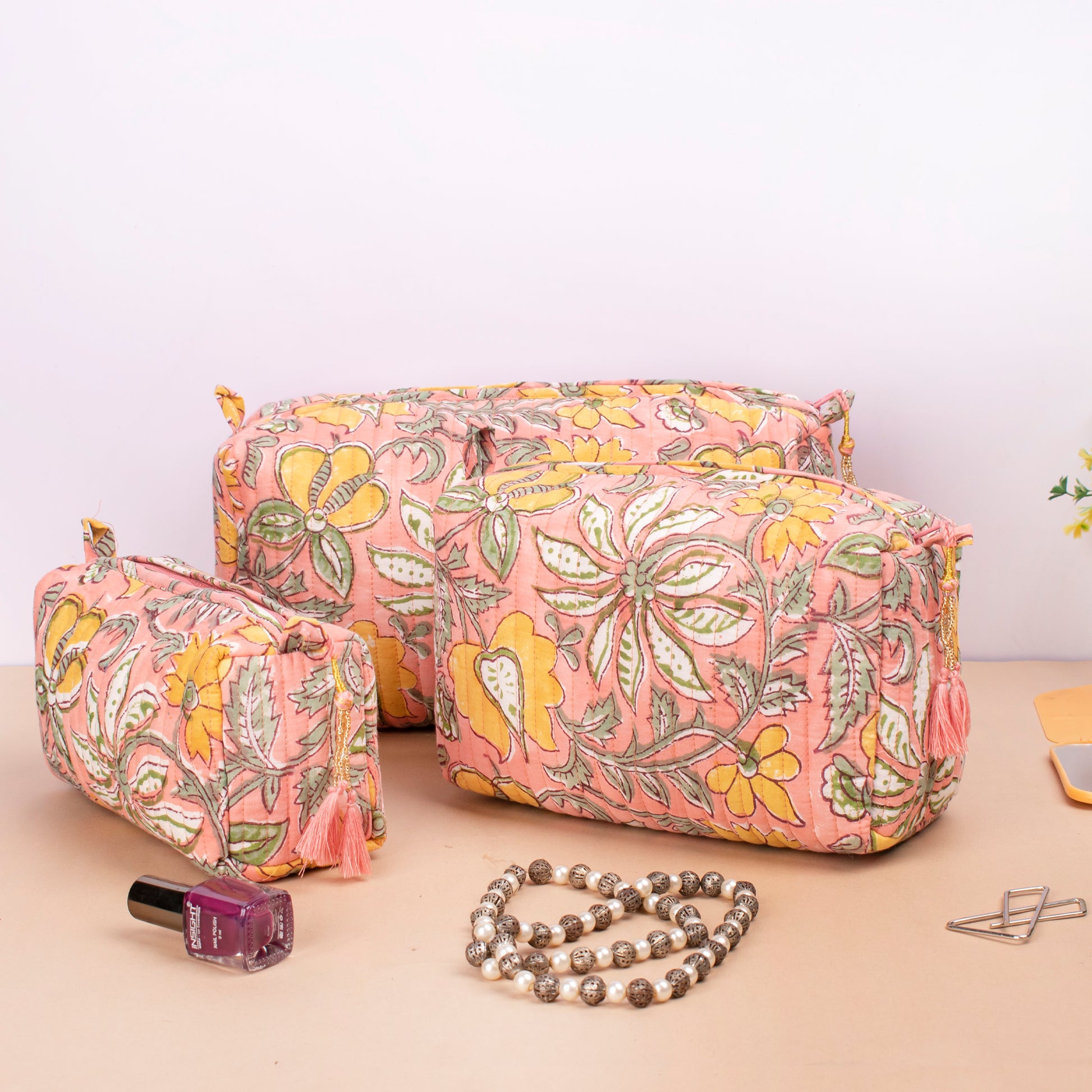 Handmade Cotton Toiletry Bag, Makeup Bag With Compartments, Small Makeup Bag, Hand Block Print Wash Bag, Cotton Makeup Bag - Set of 3