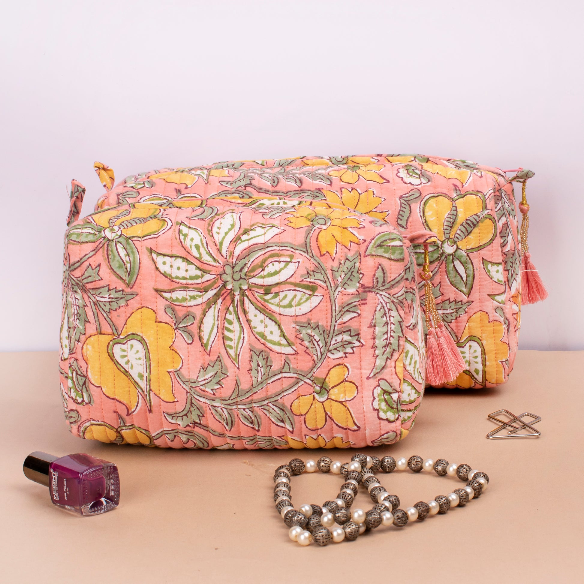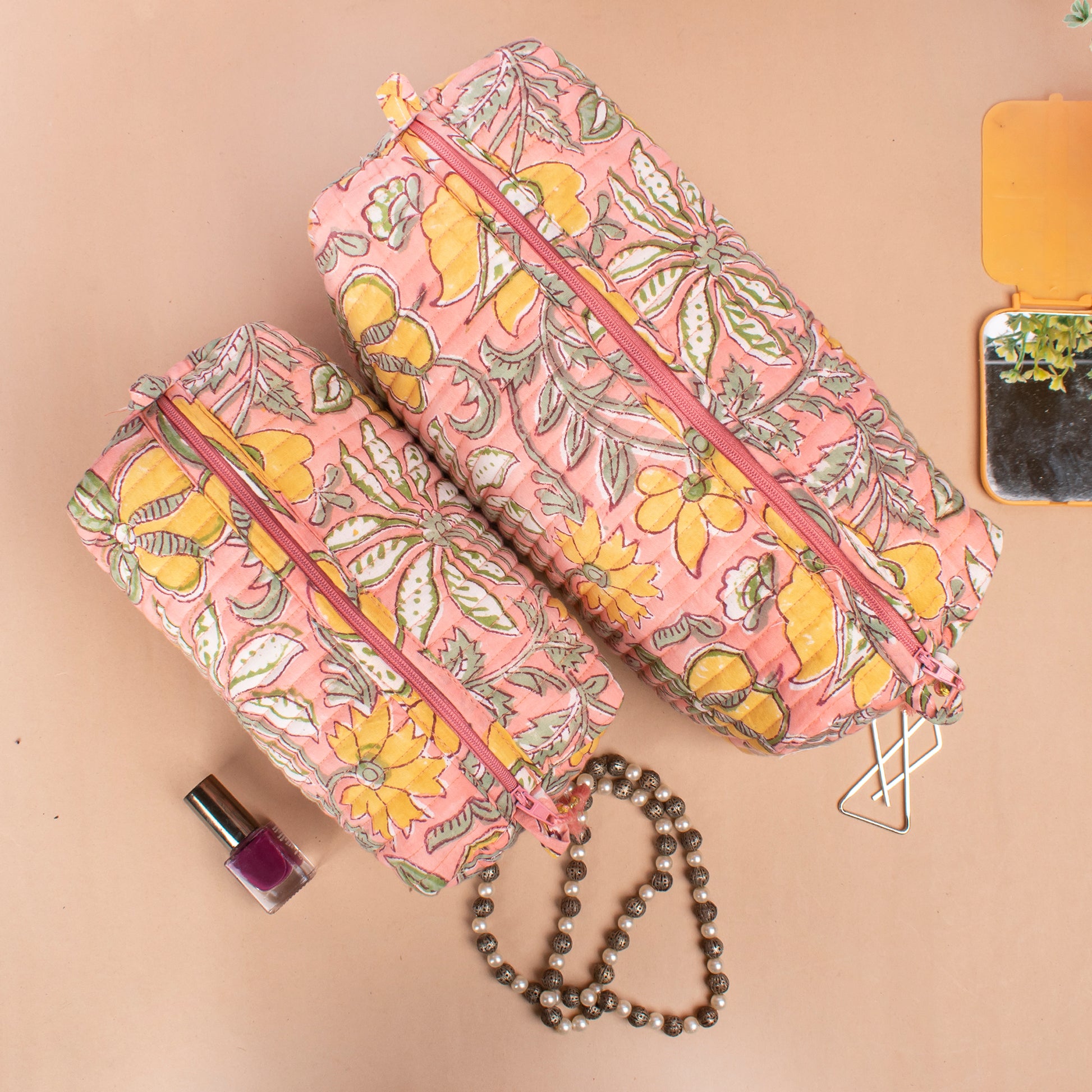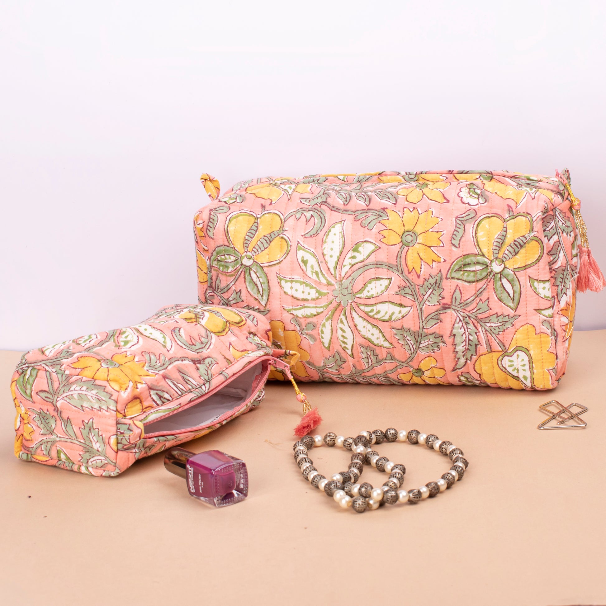 The hand block printed large toiletry bag is a delightful fusion of practicality and artistic flair. Crafted with meticulous attention to detail, each bag showcases a vibrant array of hand block printed designs, making it a unique and eye-catching accessory for your travels or daily routines.
