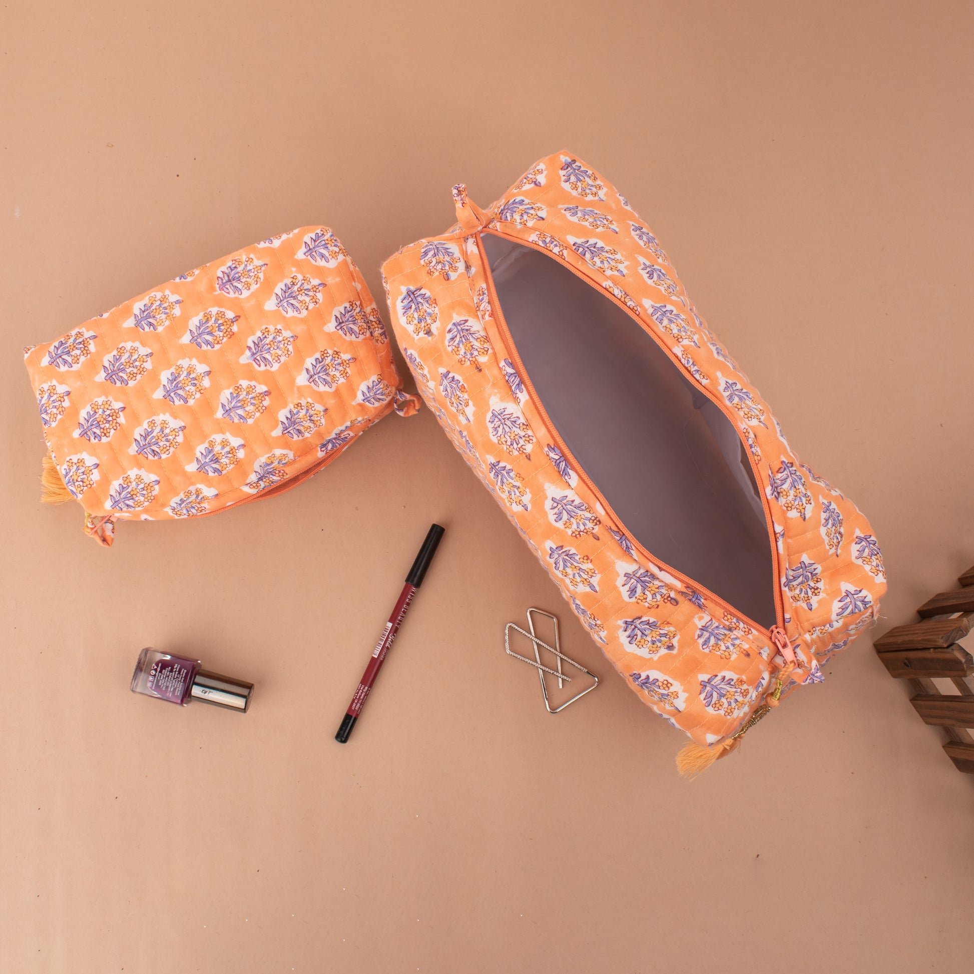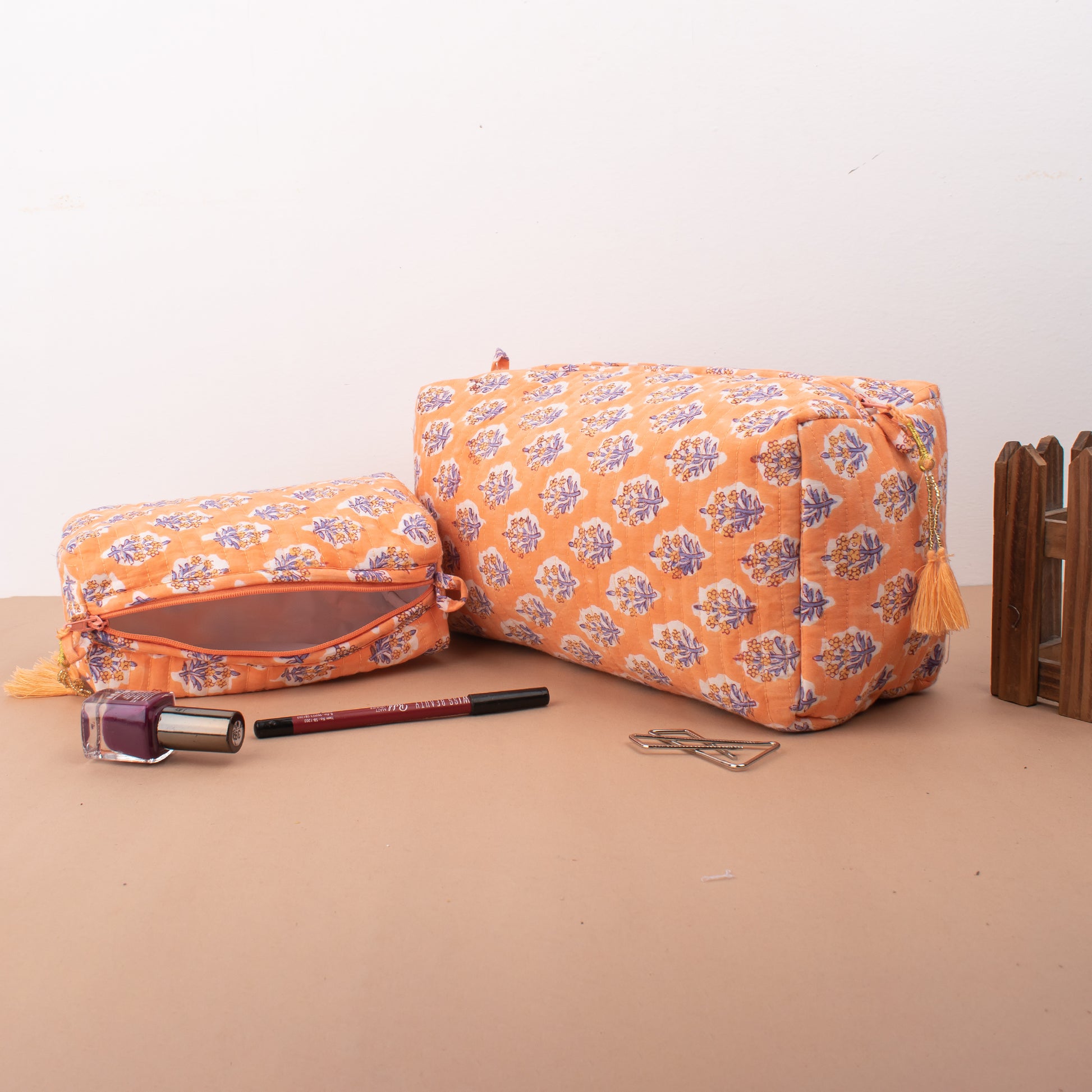 The assorted hand block printed large toiletry bag is a delightful fusion of practicality and artistic flair. Crafted with meticulous attention to detail, each bag showcases a vibrant array of hand block printed designs, making it a unique and eye-catching accessory for your travels or daily routines.