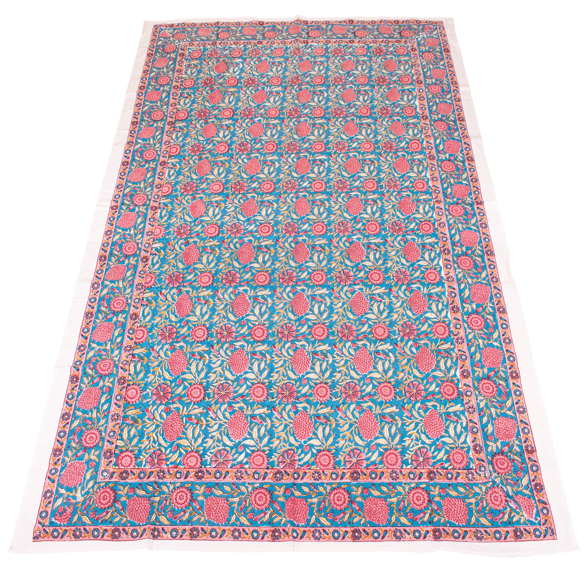 Brighten your table with this floral hand block print tablecloth, made from breathable cotton fabric. Its colorful boho-inspired design brings life to casual breakfasts, outdoor picnics, or festive dinners. Handcrafted using traditional printing techniques, this table cover adds artistic flair to your kitchen or dining area.