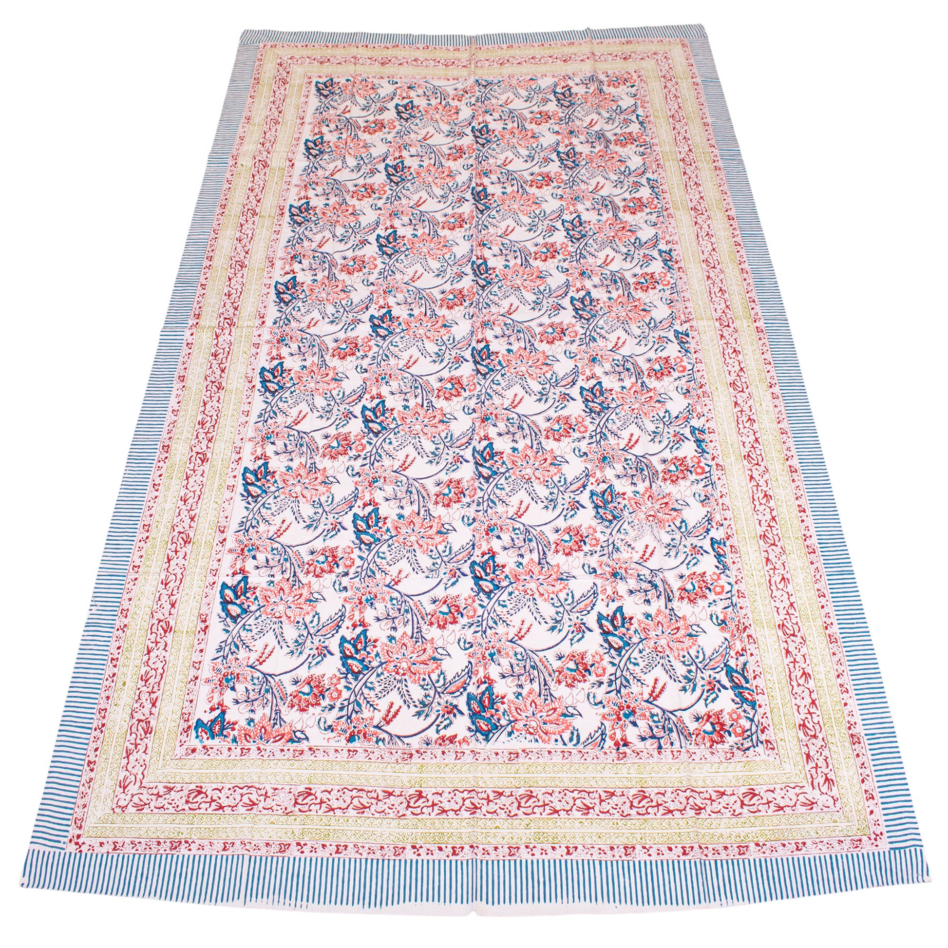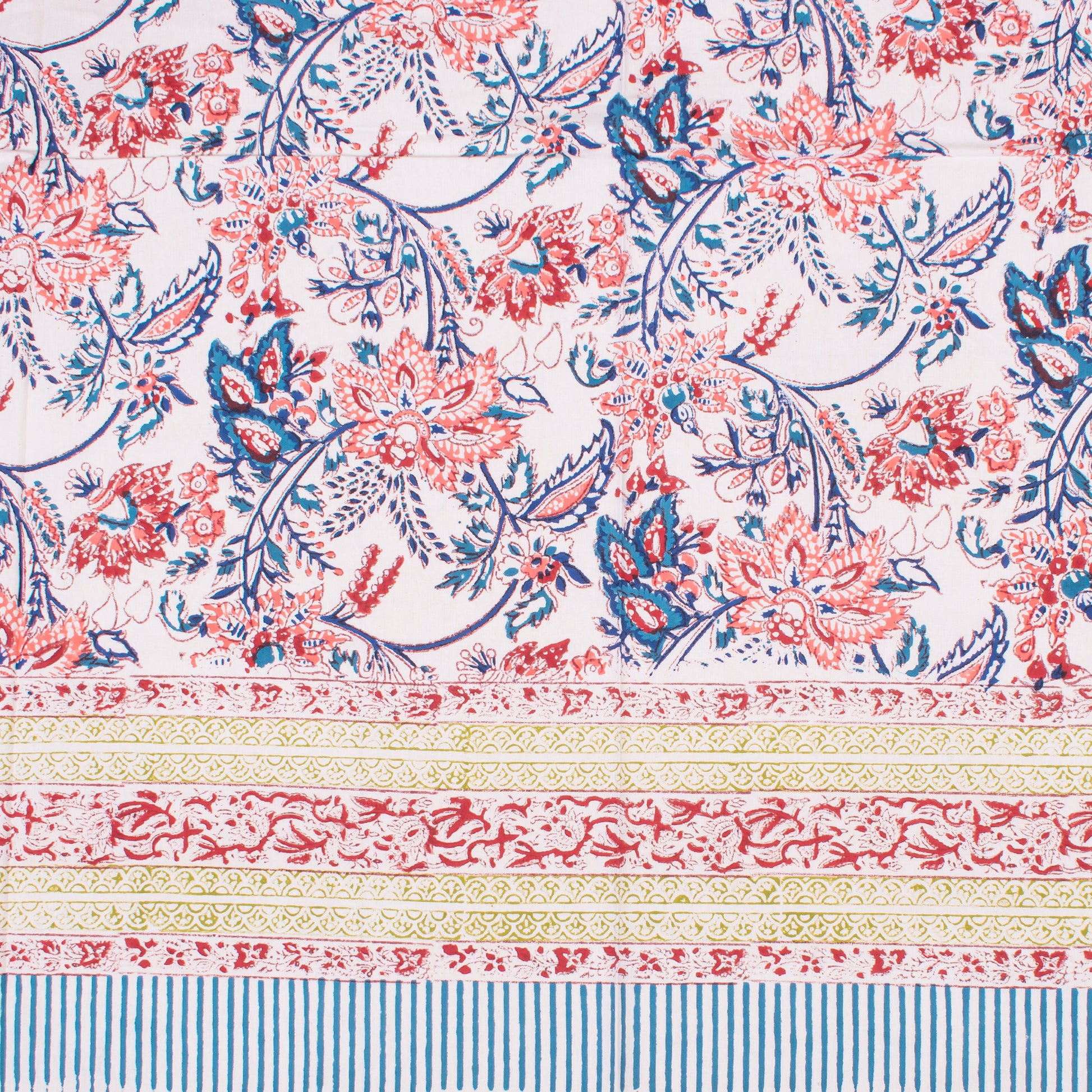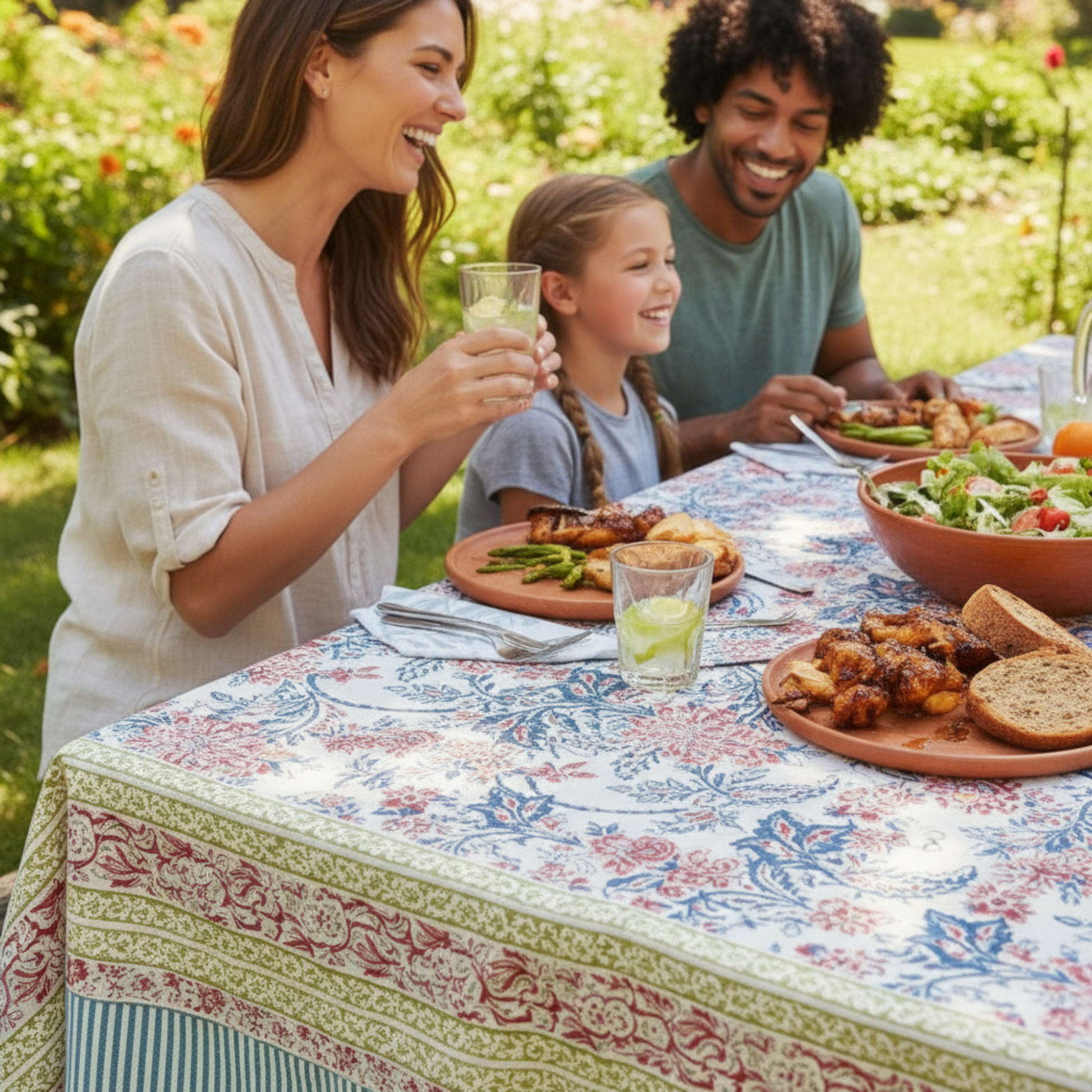 Brighten your table with this floral hand block print tablecloth, made from breathable cotton fabric. Its colorful boho-inspired design brings life to casual breakfasts, outdoor picnics, or festive dinners. Handcrafted using traditional printing techniques, this table cover adds artistic flair to your kitchen or dining area.