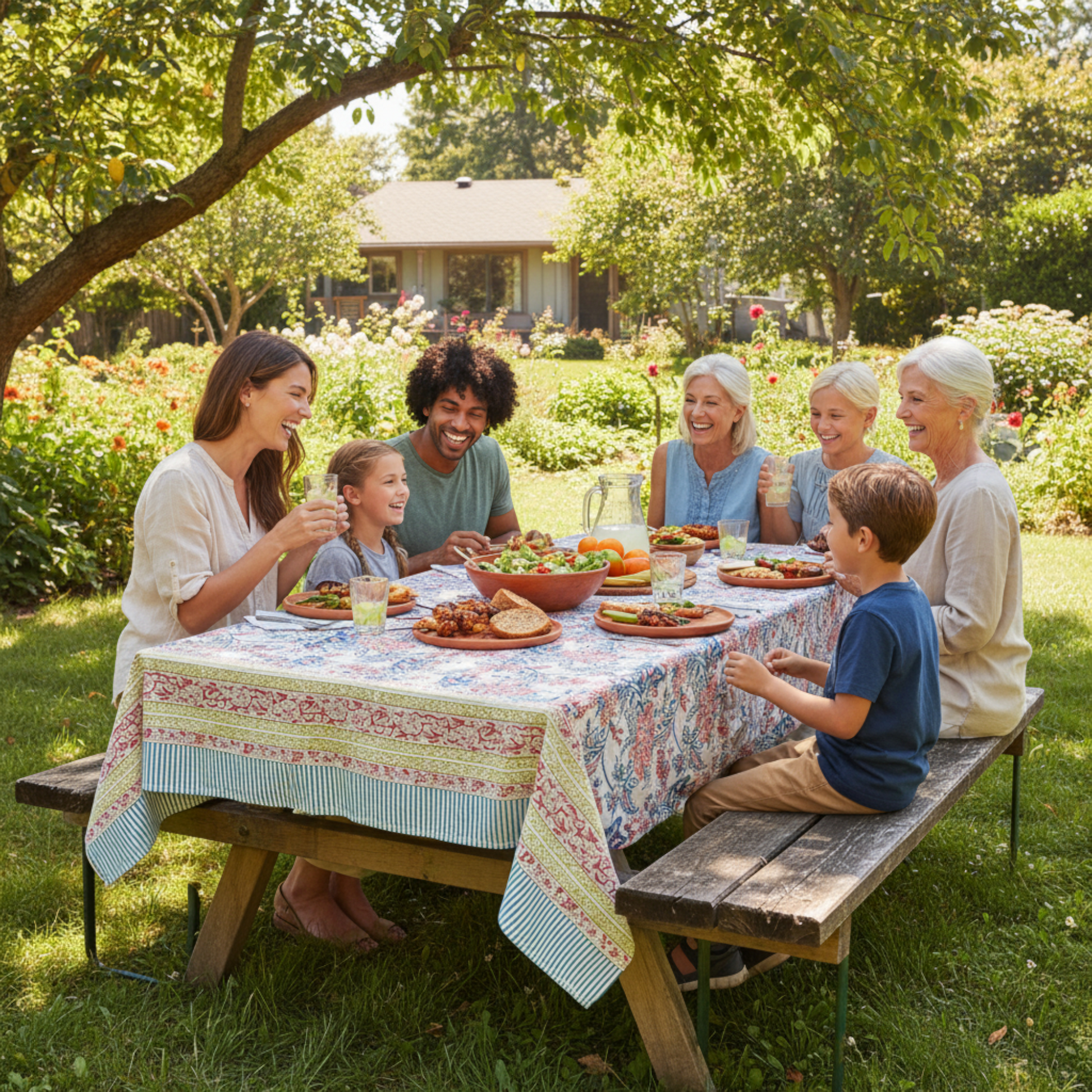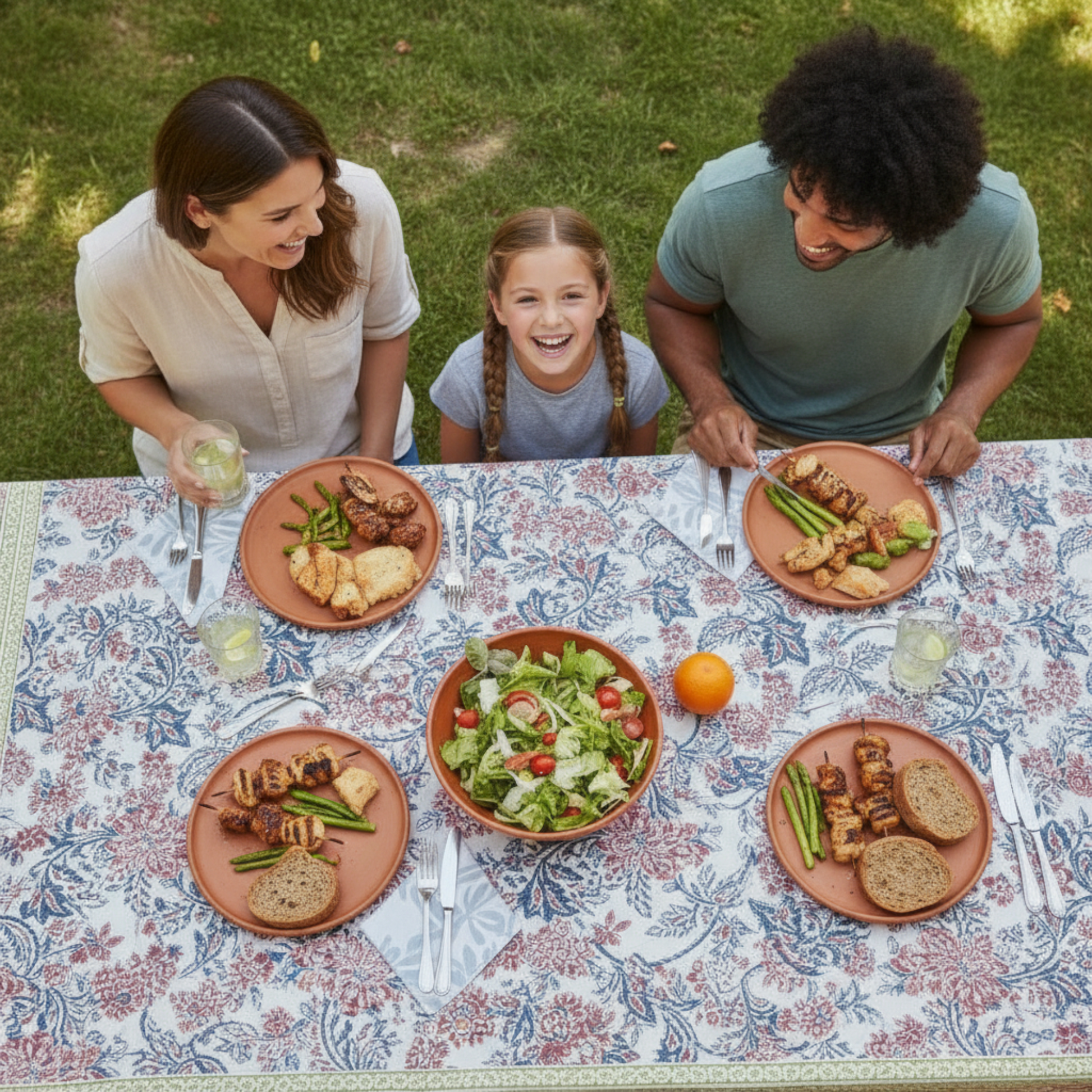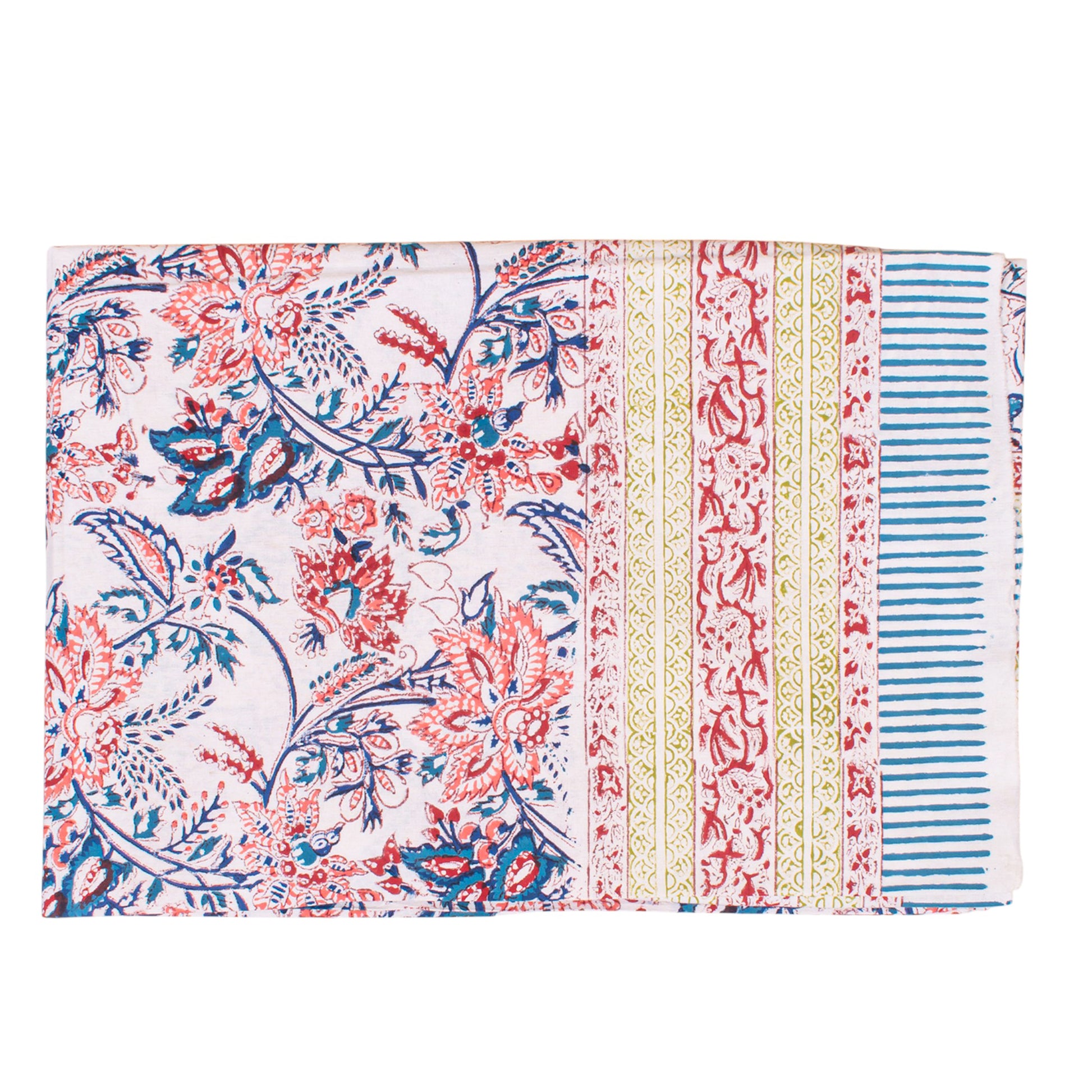Brighten your table with this floral hand block print tablecloth, made from breathable cotton fabric. Its colorful boho-inspired design brings life to casual breakfasts, outdoor picnics, or festive dinners. Handcrafted using traditional printing techniques, this table cover adds artistic flair to your kitchen or dining area.