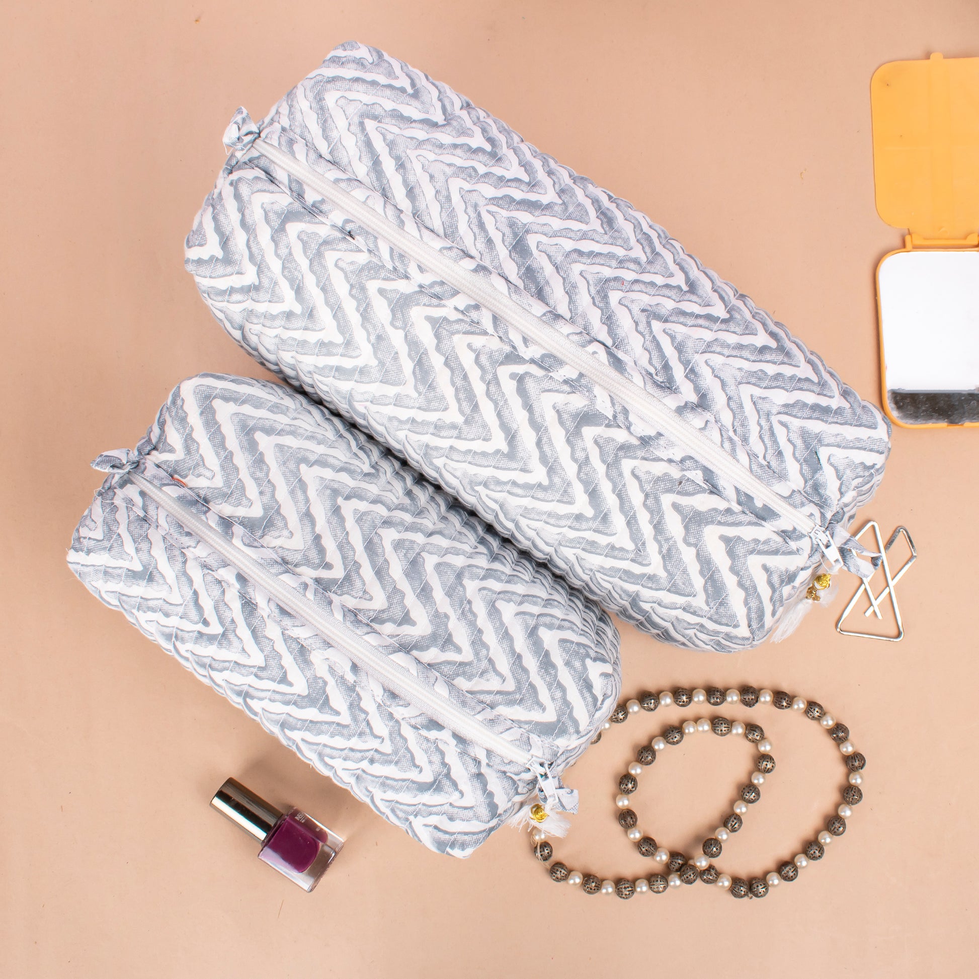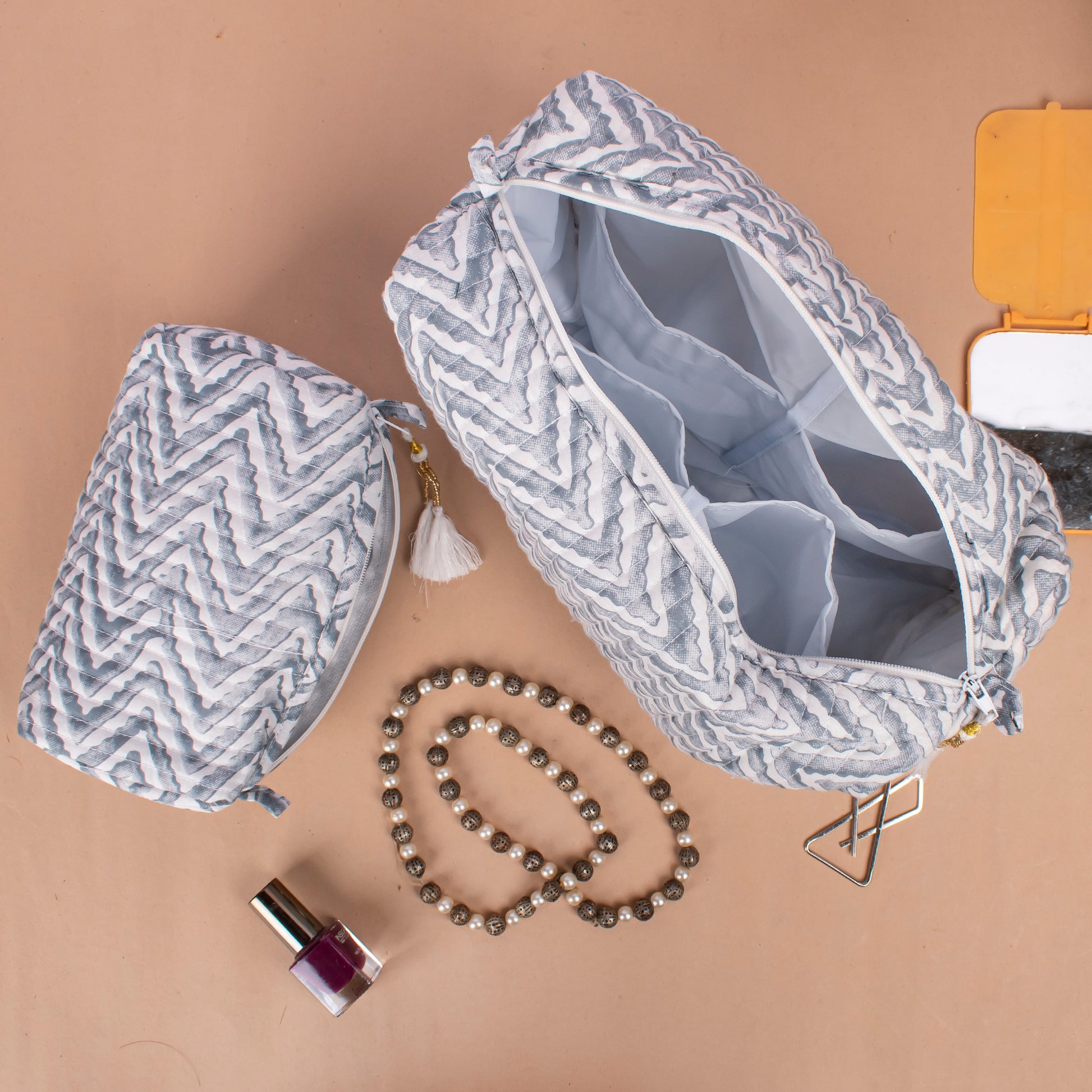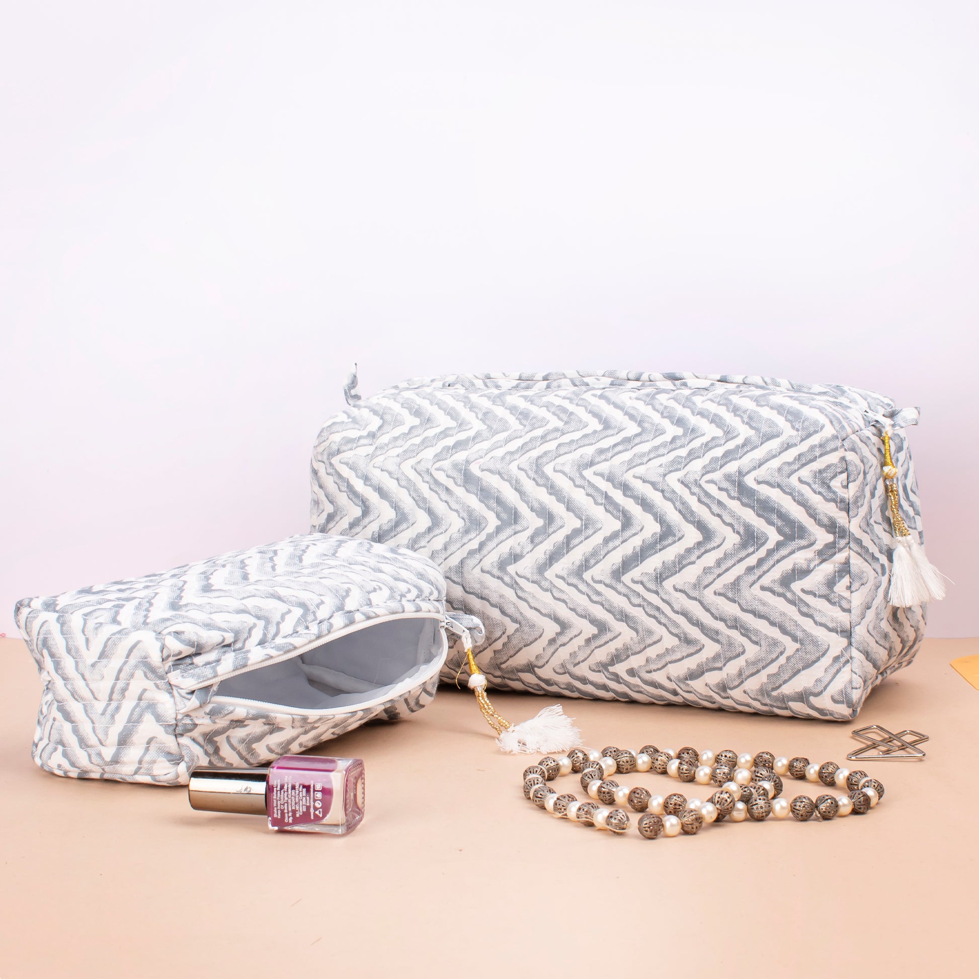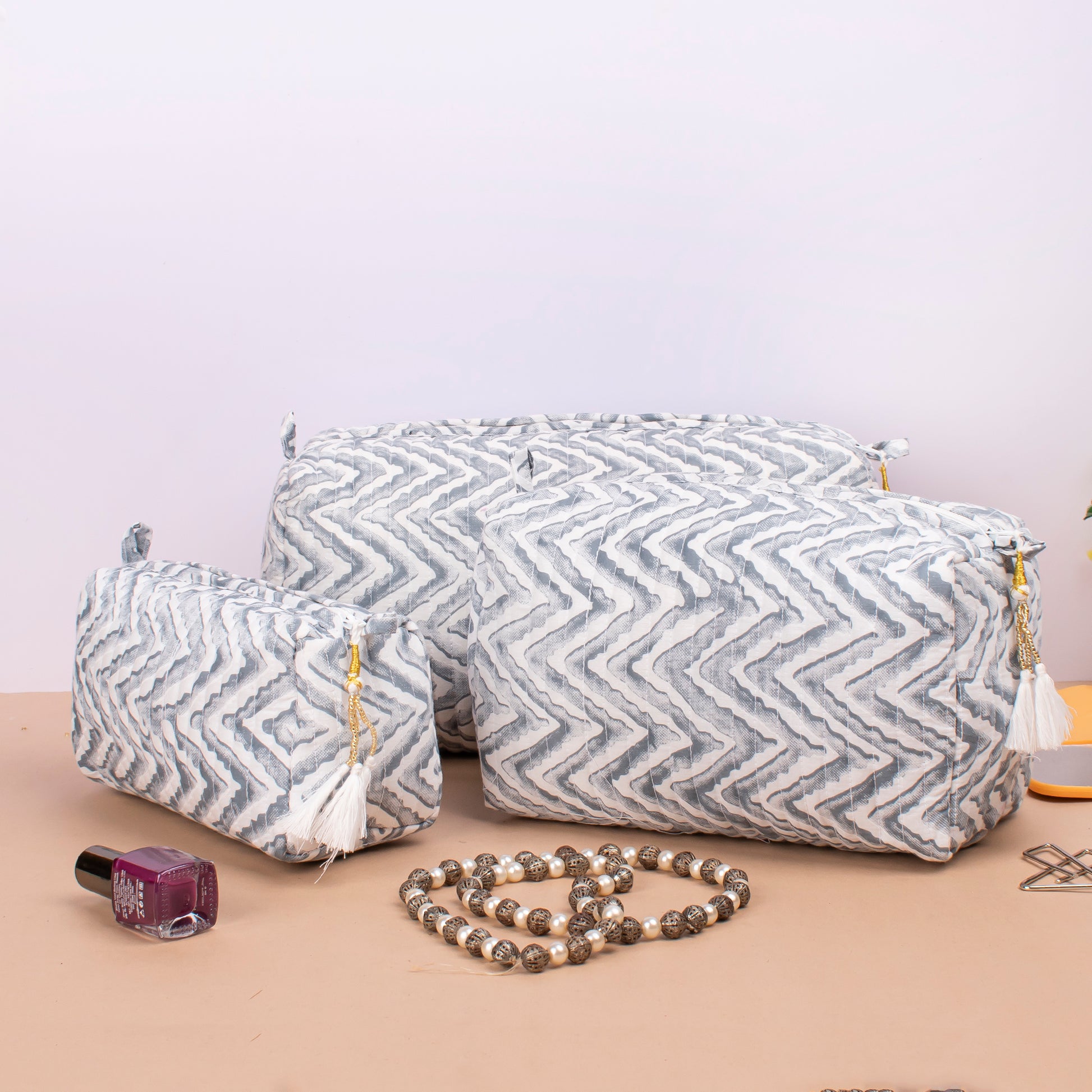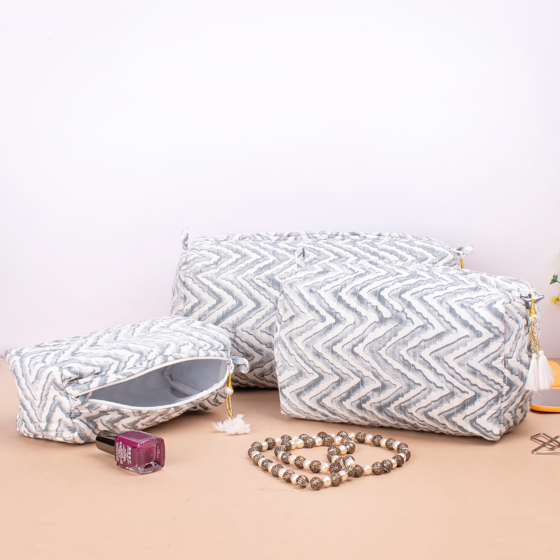 Makeup Bag With Compartments, Small Makeup Bag, Hand Block Print Wash Bag, Cotton Makeup Bag - Set of 3