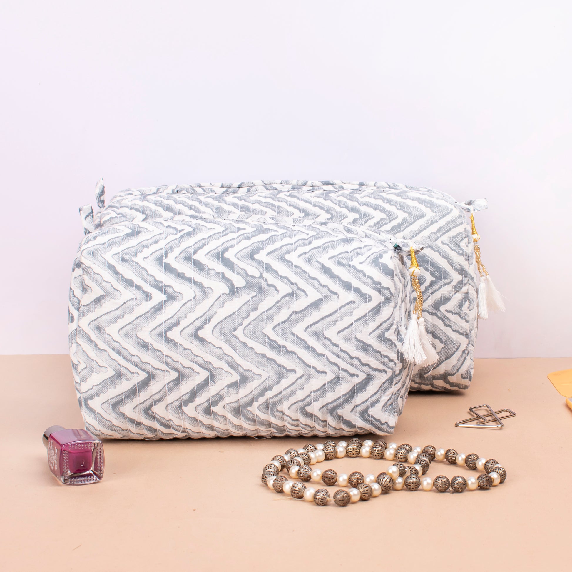 The hand block printed large toiletry bag is a delightful fusion of practicality and artistic flair. Crafted with meticulous attention to detail, each bag showcases a vibrant array of hand block printed designs, making it a unique and eye-catching accessory for your travels or daily routines.