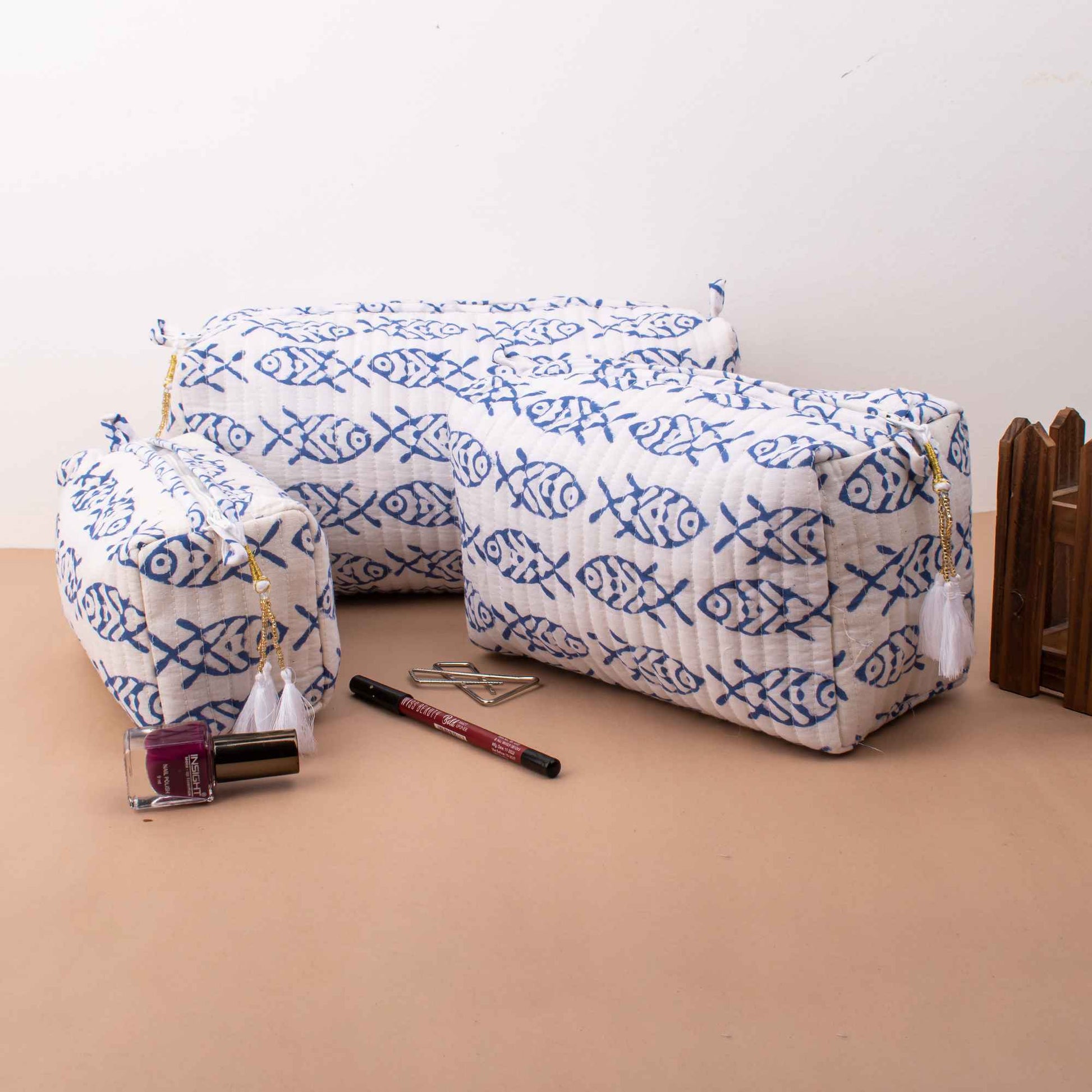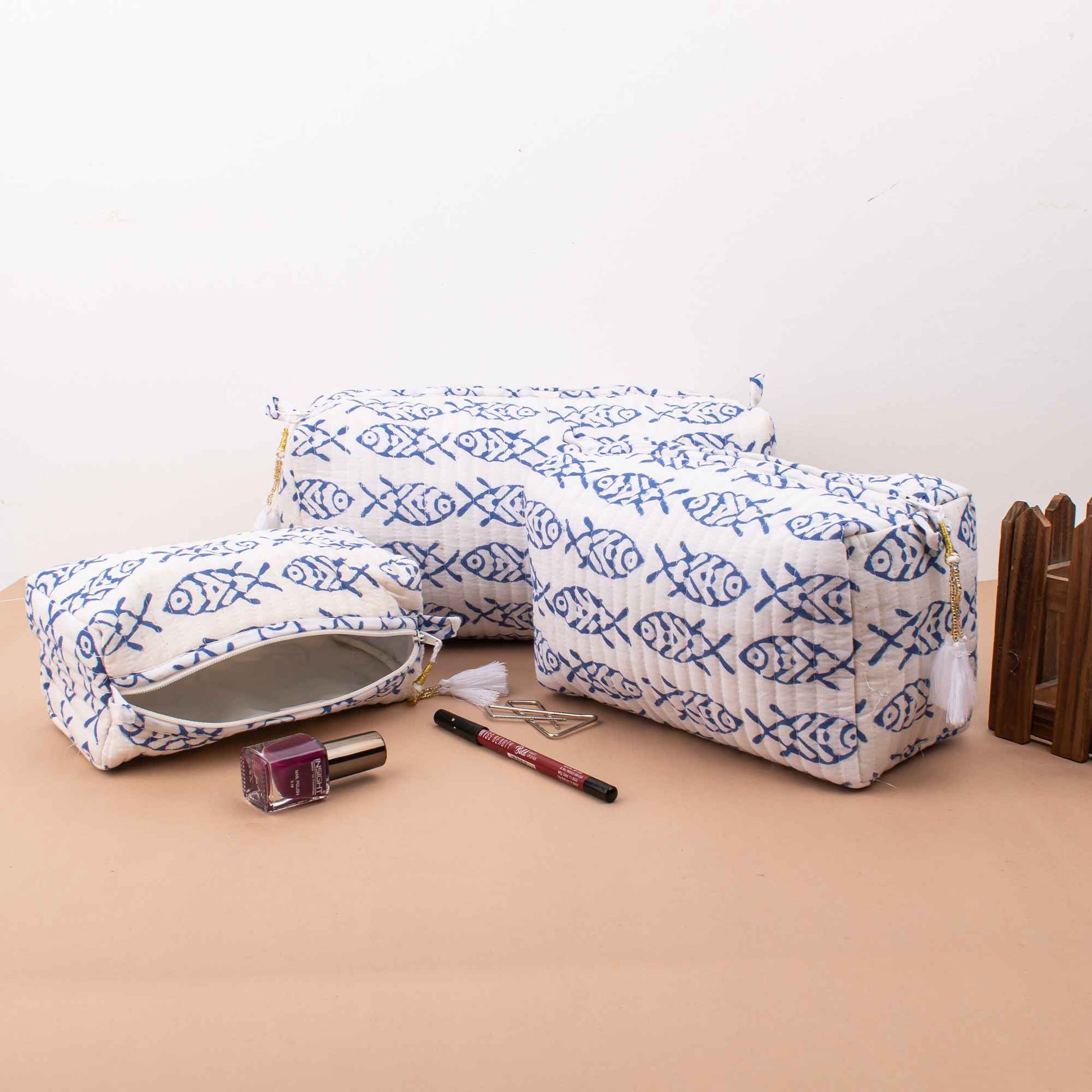 Get exceptional value and unique style with this charming makeup bag set. Each bag features a playful fish print. Premium materials, spacious interiors, and tassel accents make this set a practical and stylish choice.
