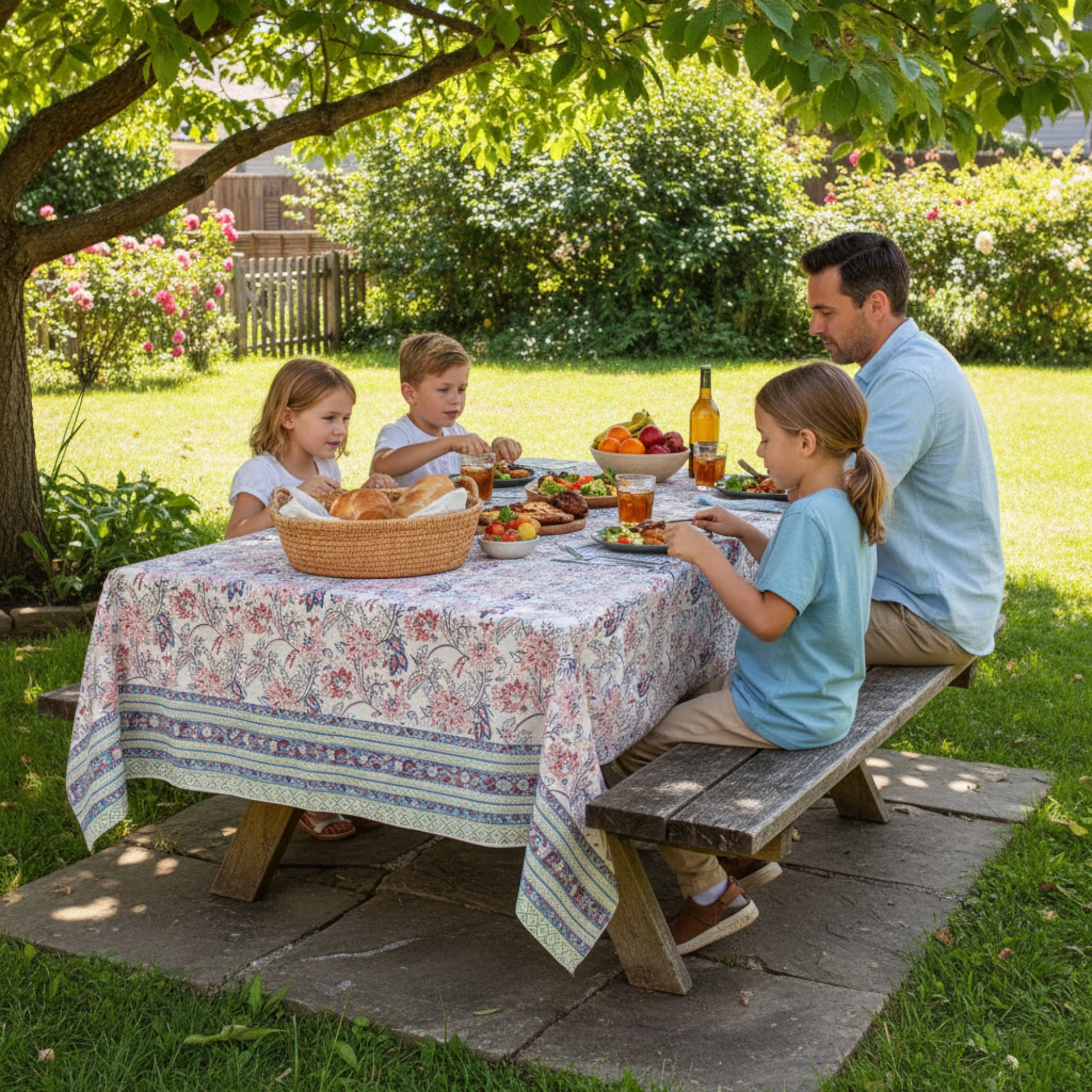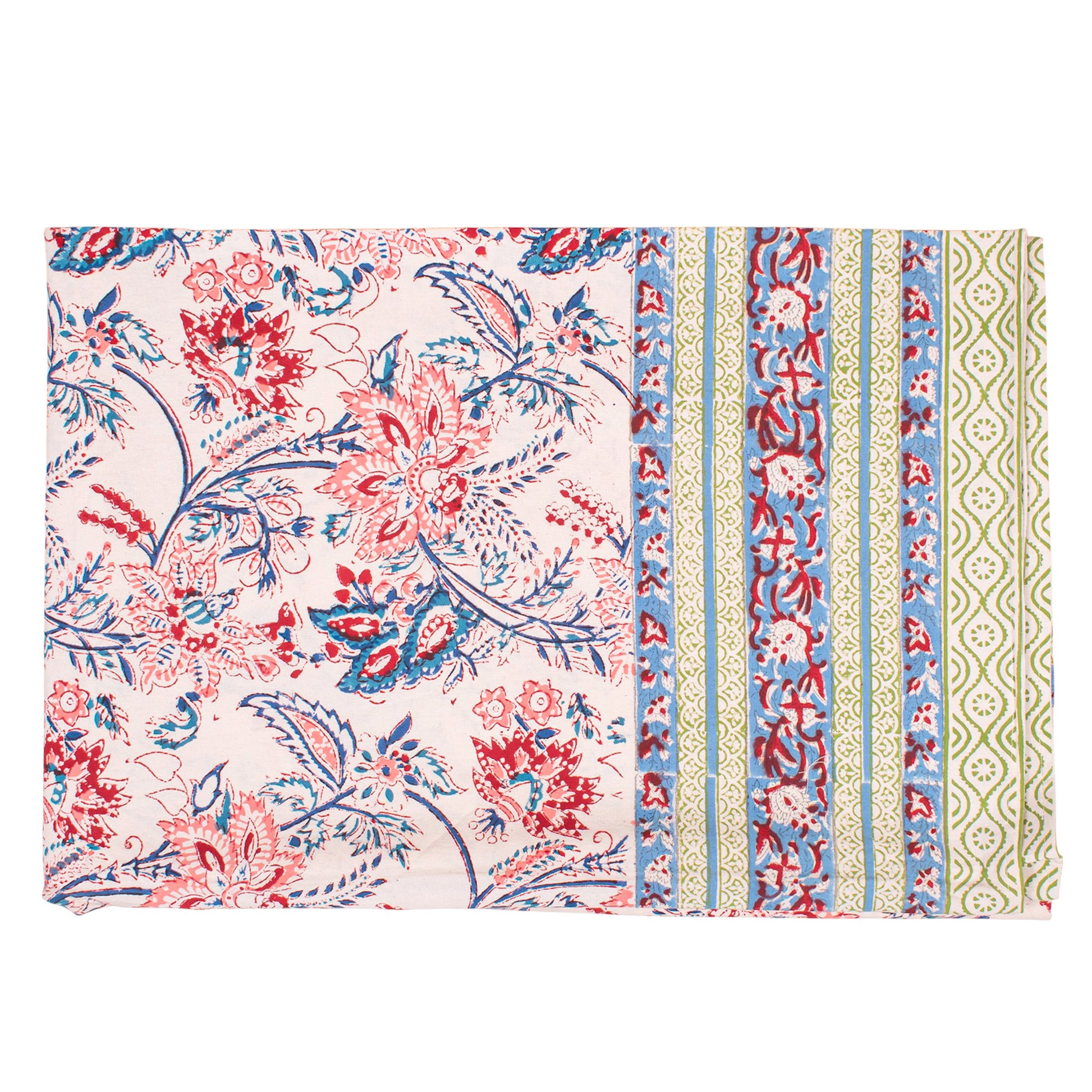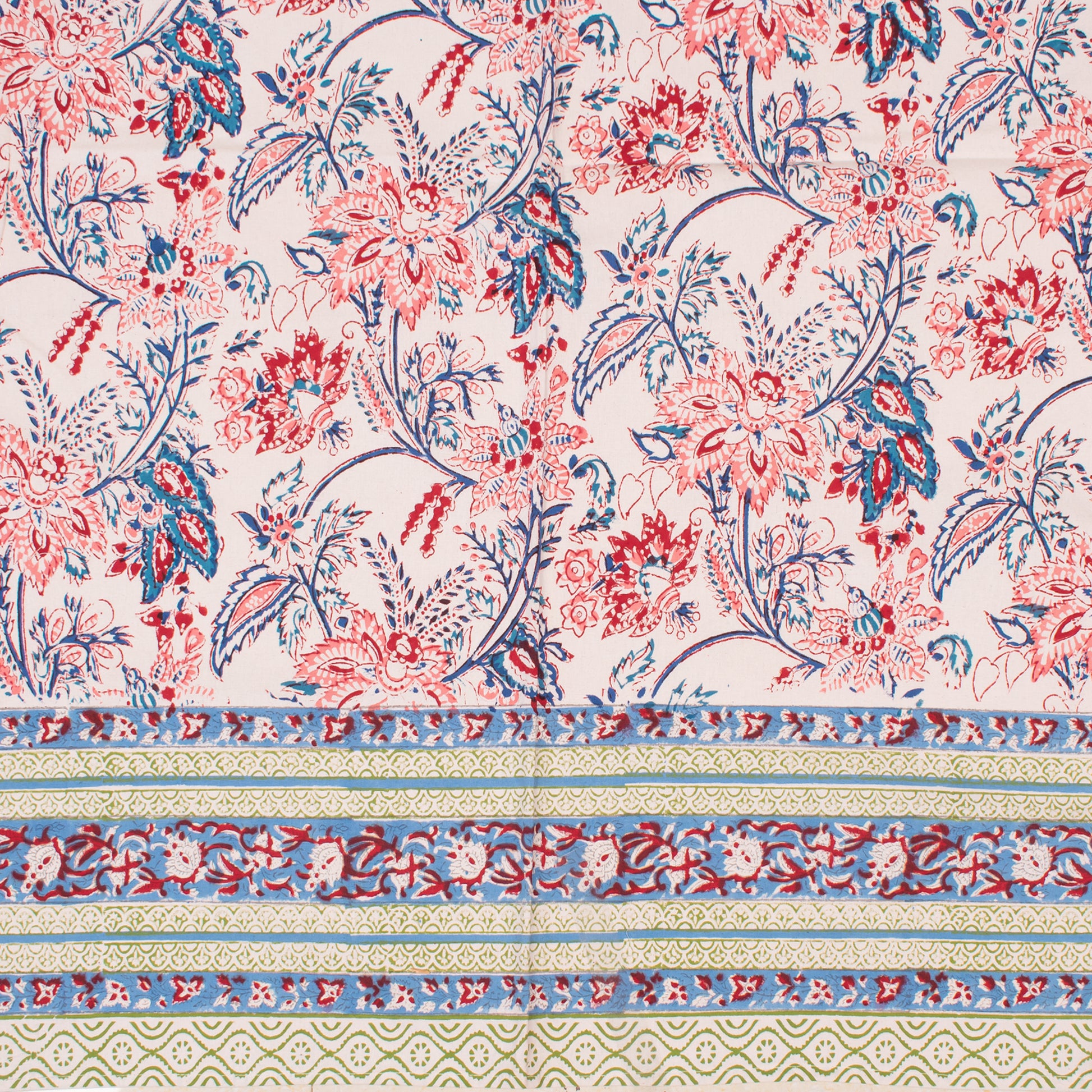 Brighten your table with this floral hand block print tablecloth, made from breathable cotton fabric. Its colorful boho-inspired design brings life to casual breakfasts, outdoor picnics, or festive dinners. Handcrafted using traditional printing techniques, this table cover adds artistic flair to your kitchen or dining area.