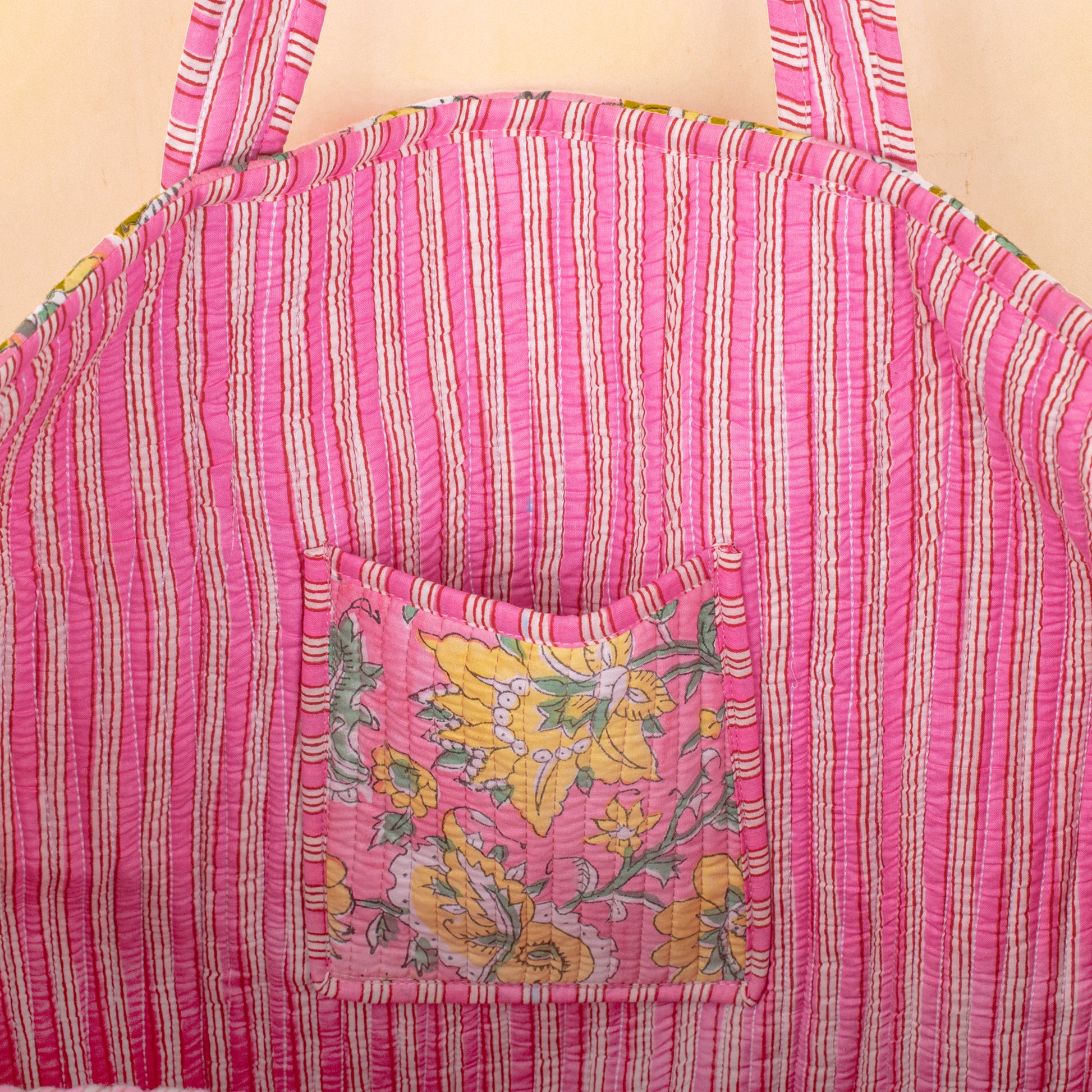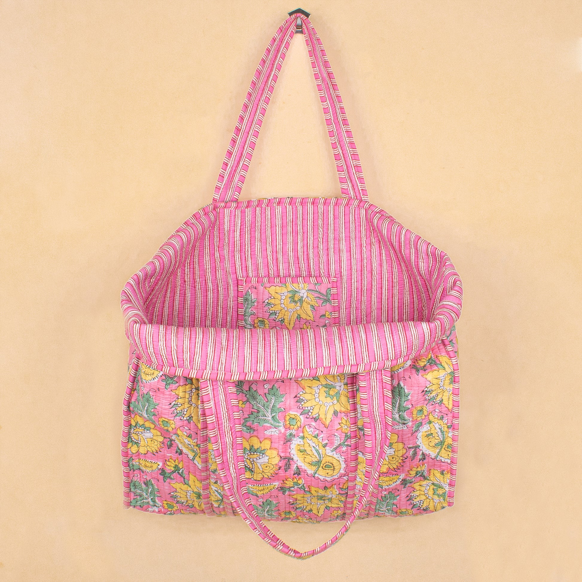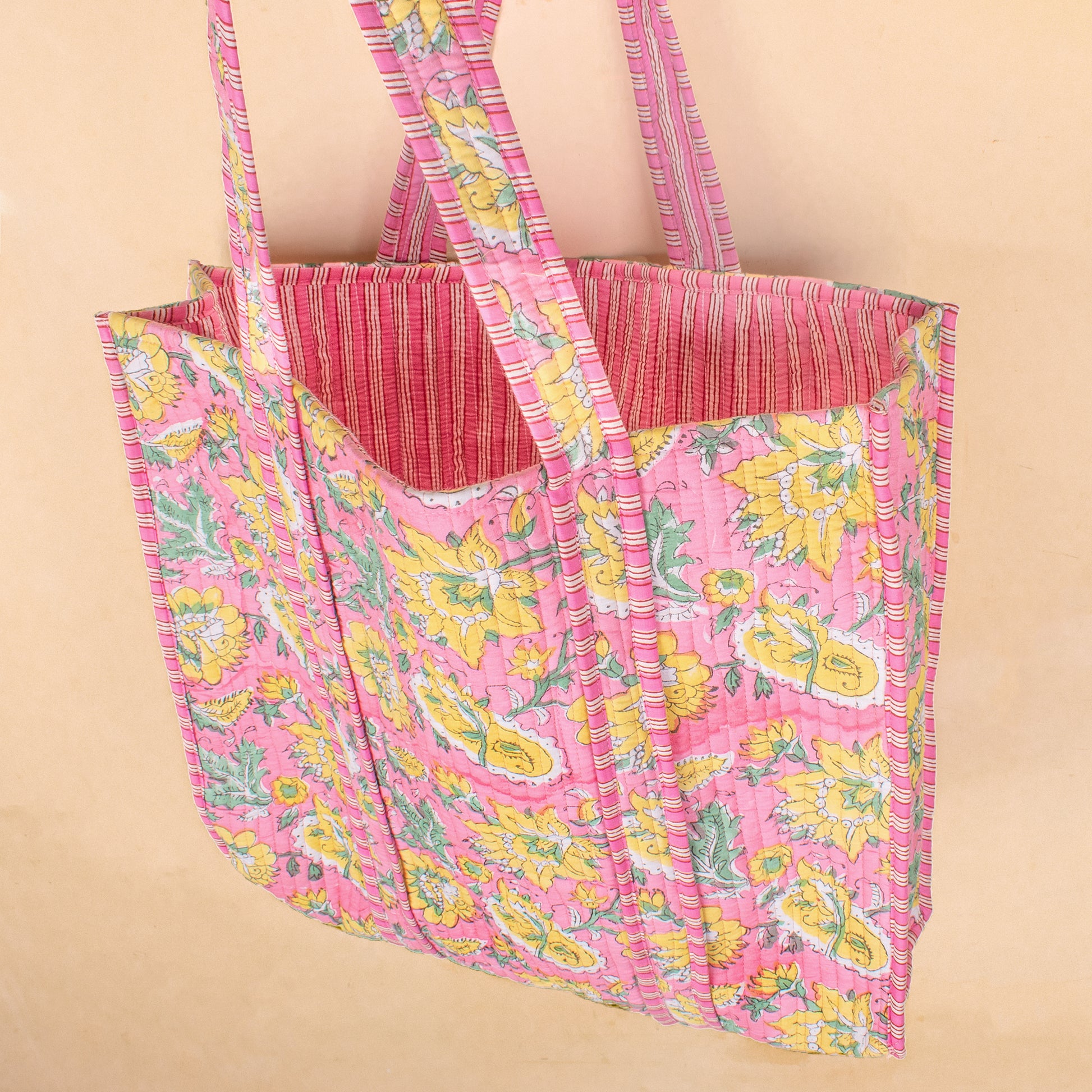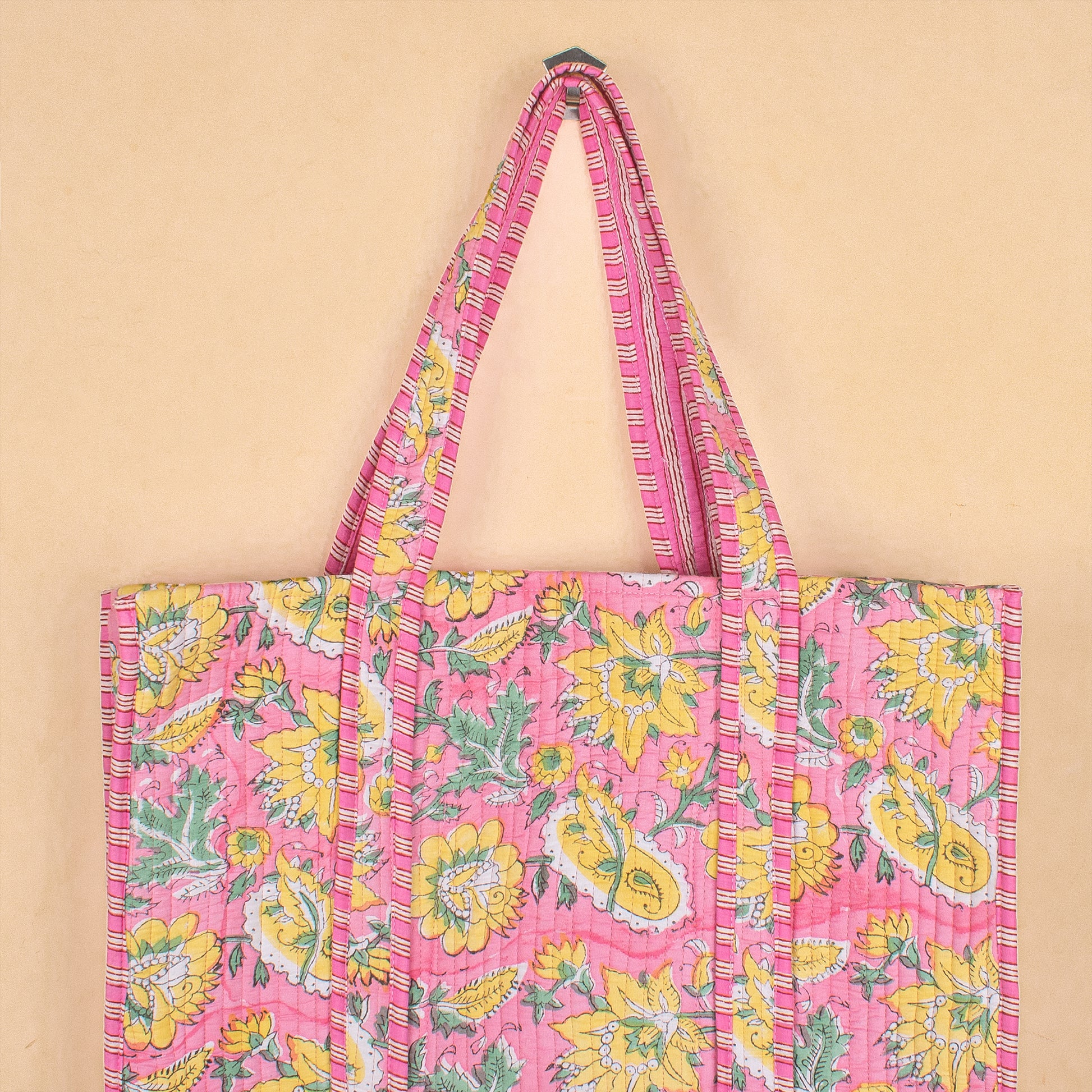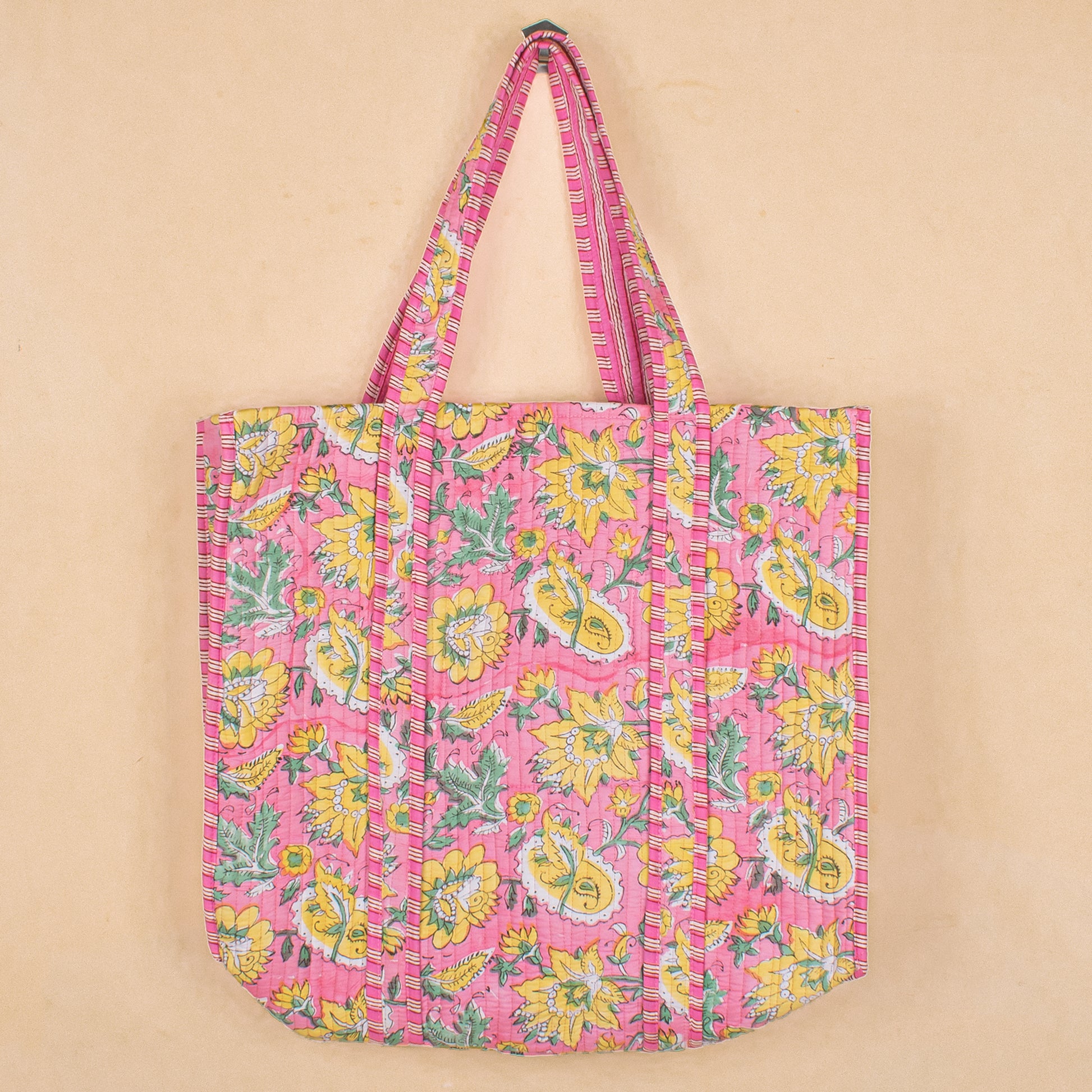 Here is a printed and colorful cotton tote bag that is not only beautiful but also durable and versatile. This bag has a pink background with attractive prints in white, yellow, and green colors that look extremely elegant and are perfect for everyday use. Designed for everyday use and carrying purposes, this Handmade Cotton Shoulder Bag can be easily carried around and can be reused multiple times.