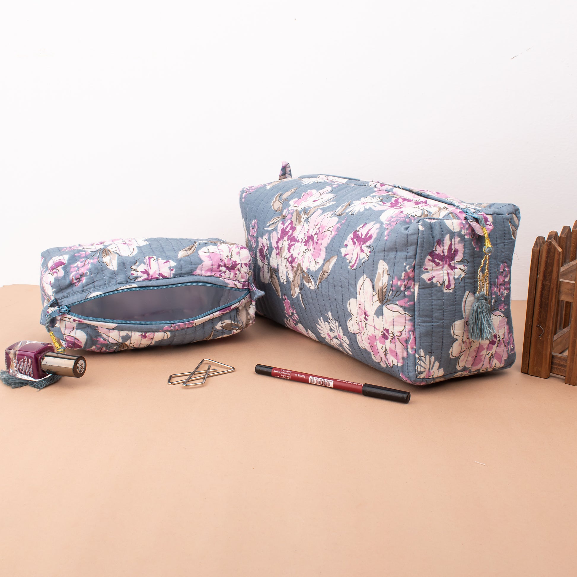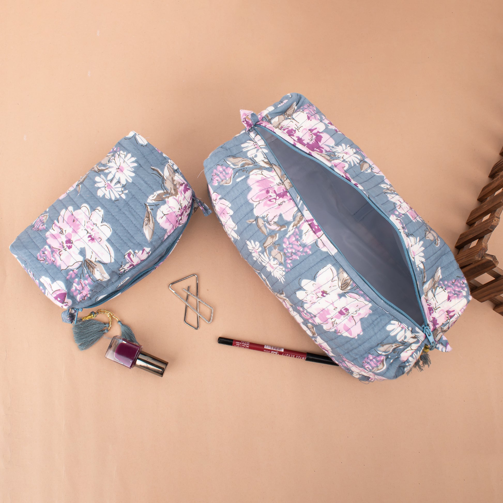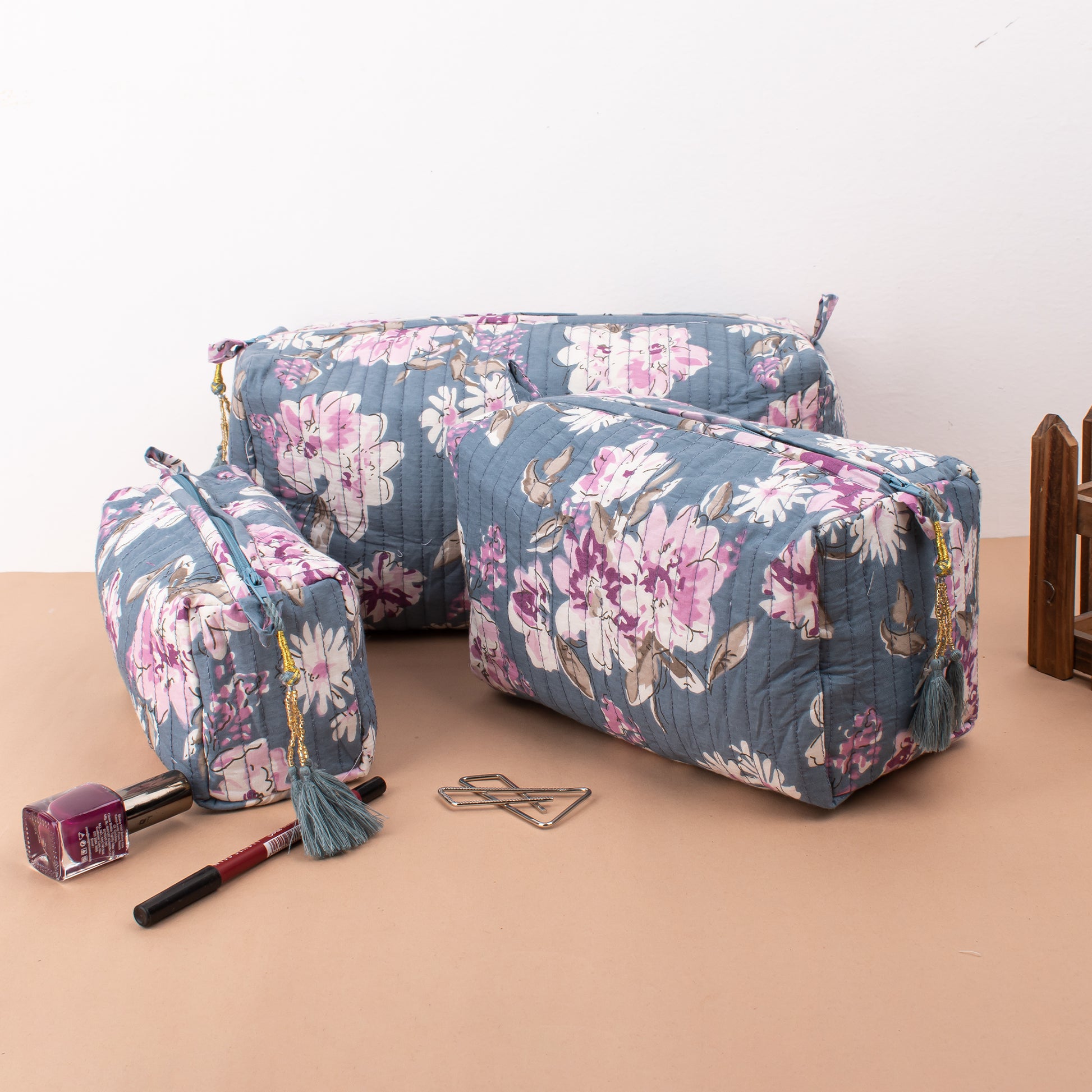 Quilted Wash Bag, Cotton Handmade Hand Block Print Toiletry Bag - Set of 3
