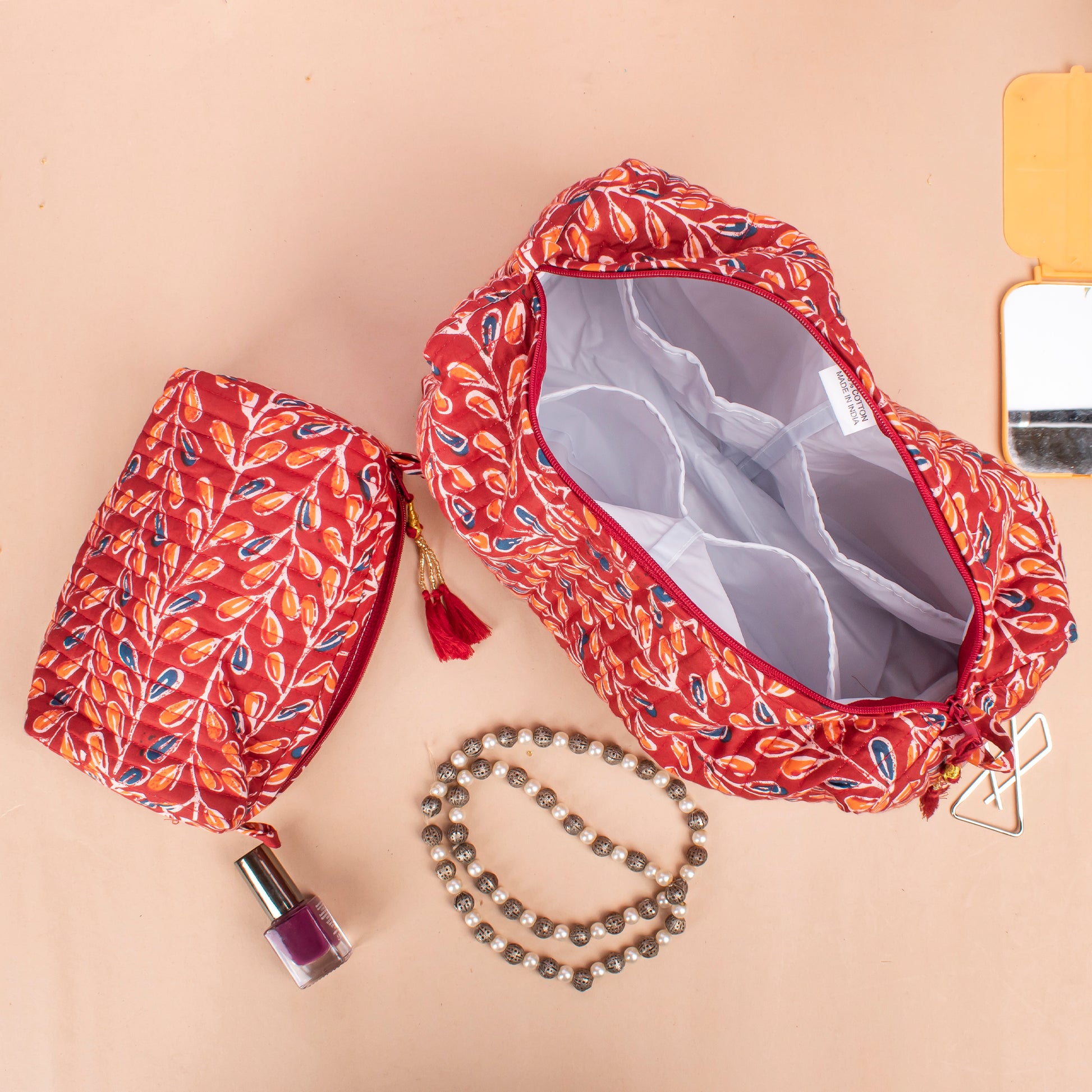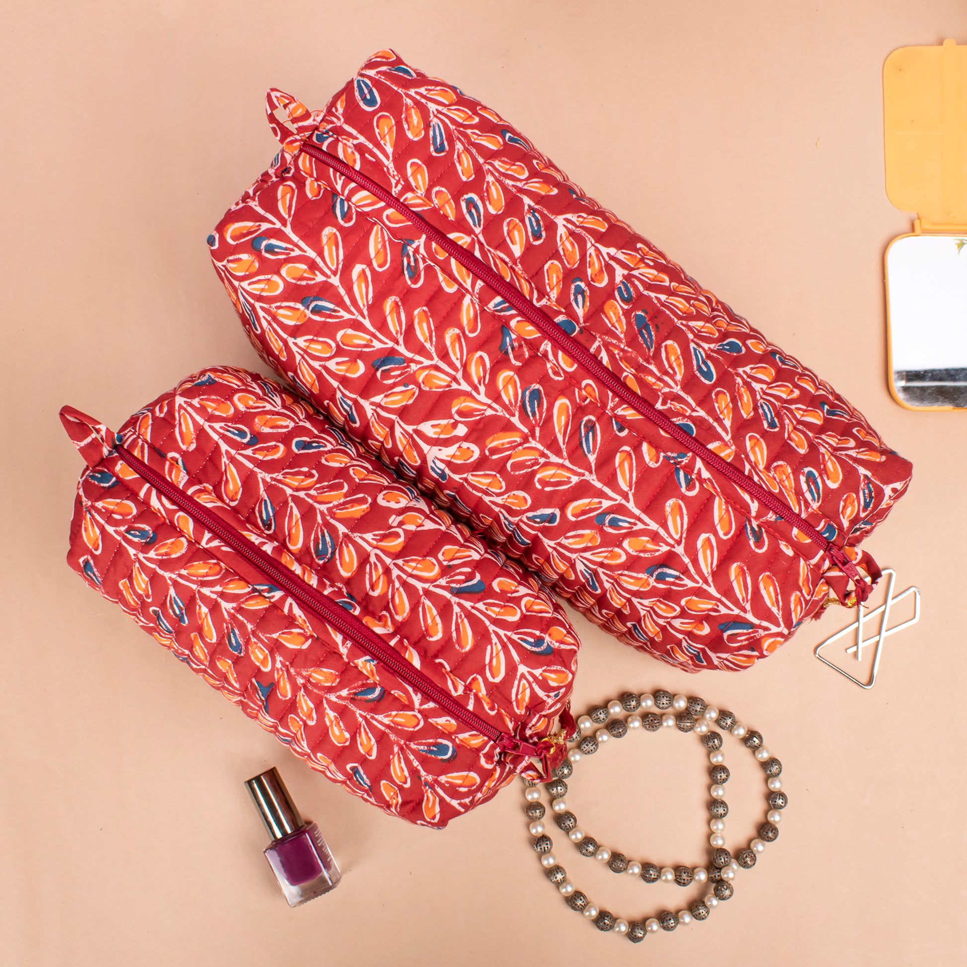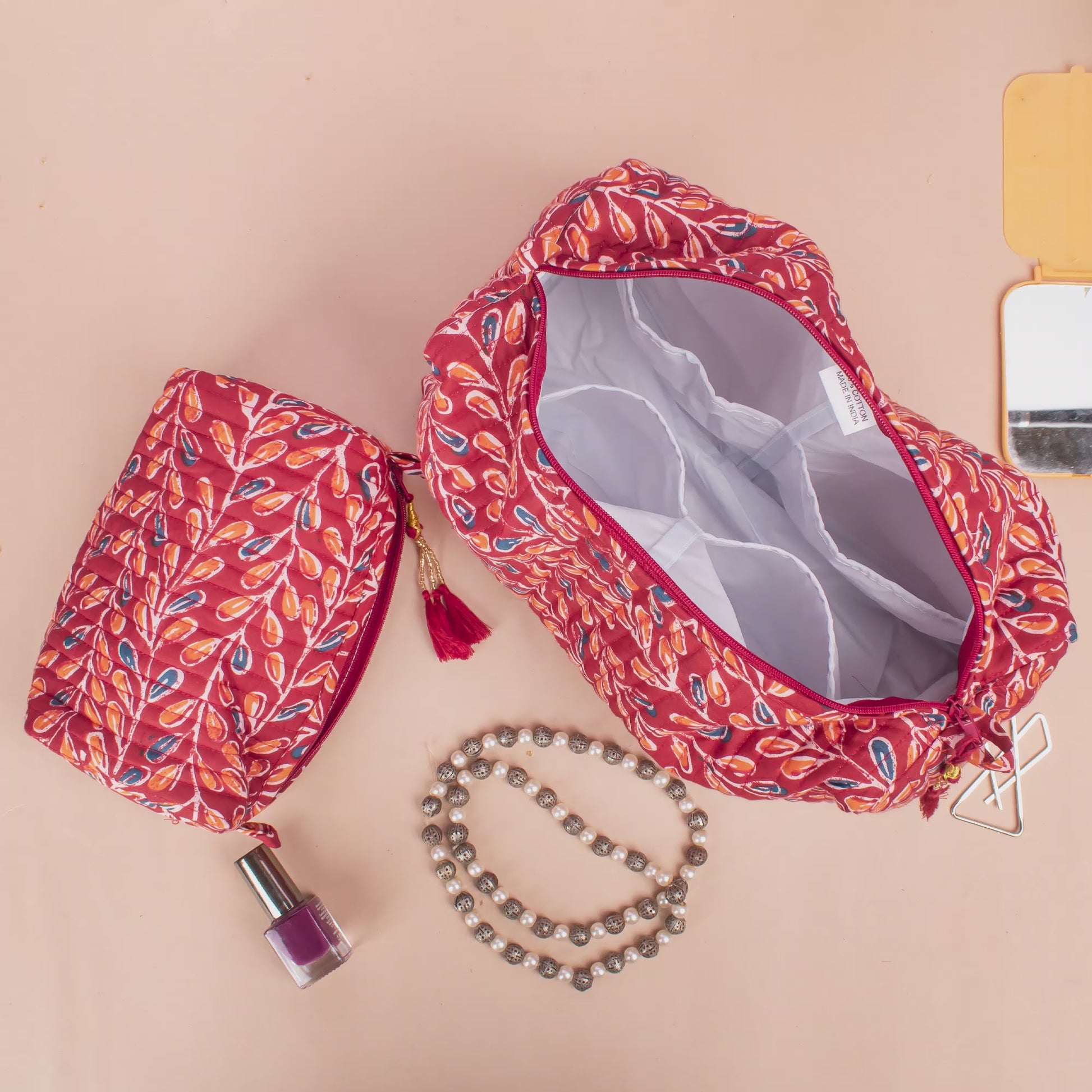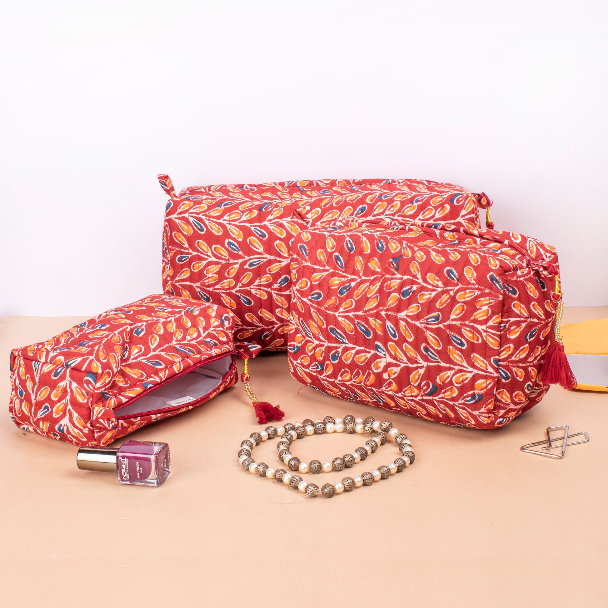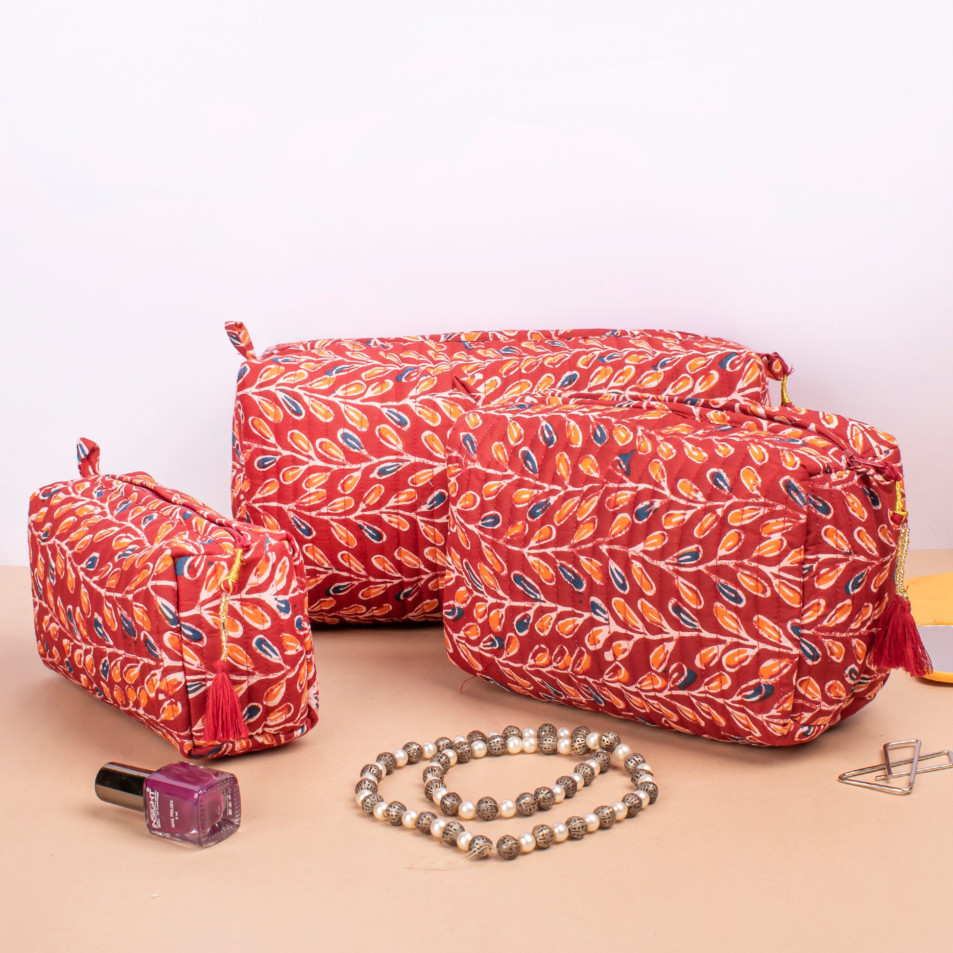 The hand block printed large toiletry bag is a delightful fusion of practicality and artistic flair. Crafted with meticulous attention to detail, each bag showcases a vibrant array of hand block printed designs, making it a unique and eye-catching accessory for your travels or daily routines.