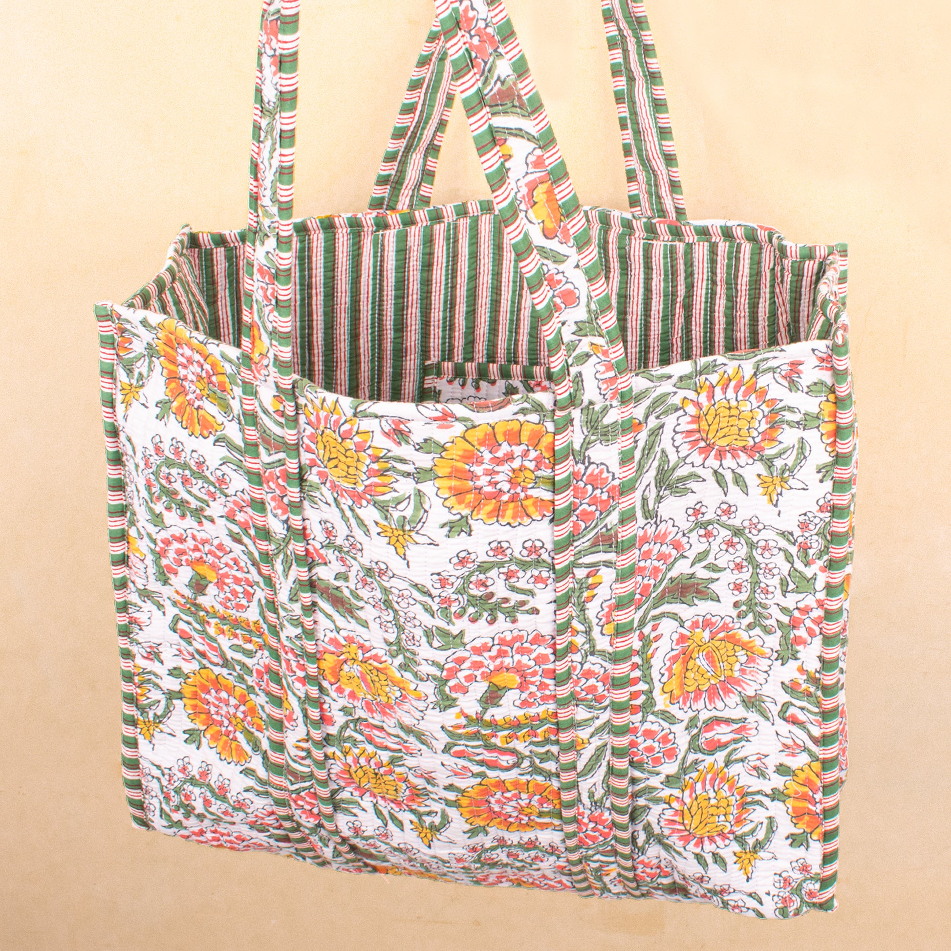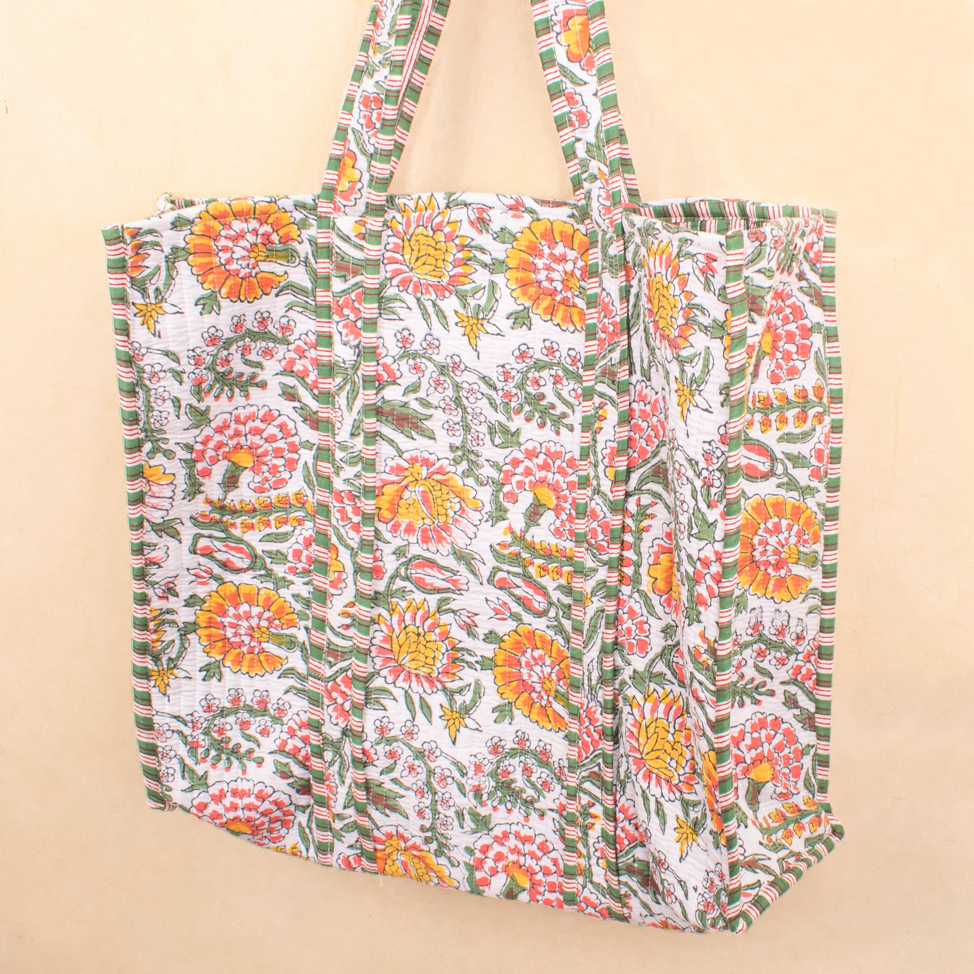 Handmade printed cotton tote bag with Custom Logo is very good alternative to plastic bags. This bag has a white background with attractive prints in white, orange, and green colors that look extremely elegant. Be it grocery shopping or anything else, plastic bags are used a lot but using cotton tote bags is very good for the environment. These Handmade Cotton shopping bag made of natural material decompose very quickly and can be used not just once but many times.