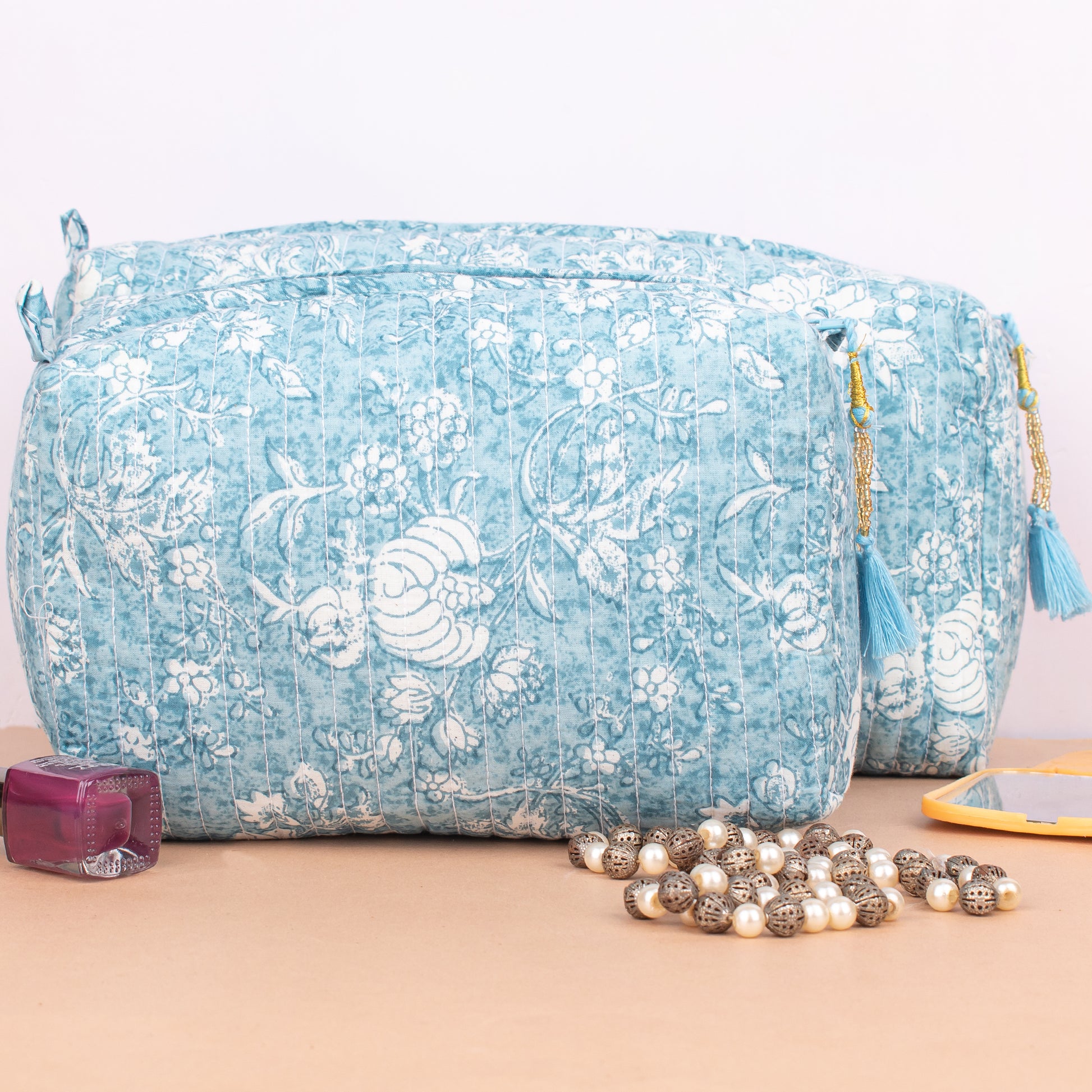 The hand block printed large toiletry bag is a delightful fusion of practicality and artistic flair. Crafted with meticulous attention to detail, each bag showcases a vibrant array of hand block printed designs, making it a unique and eye-catching accessory for your travels or daily routines.