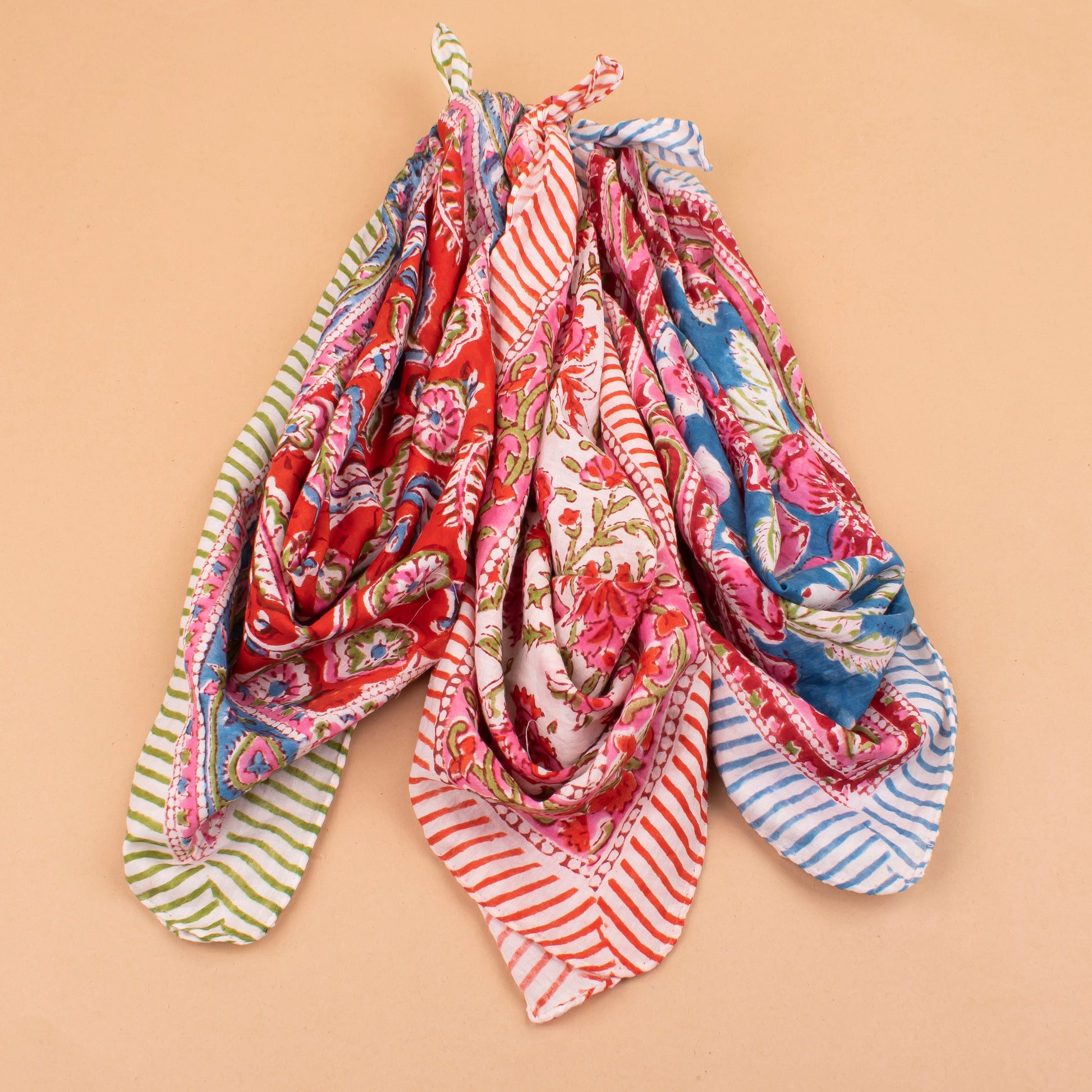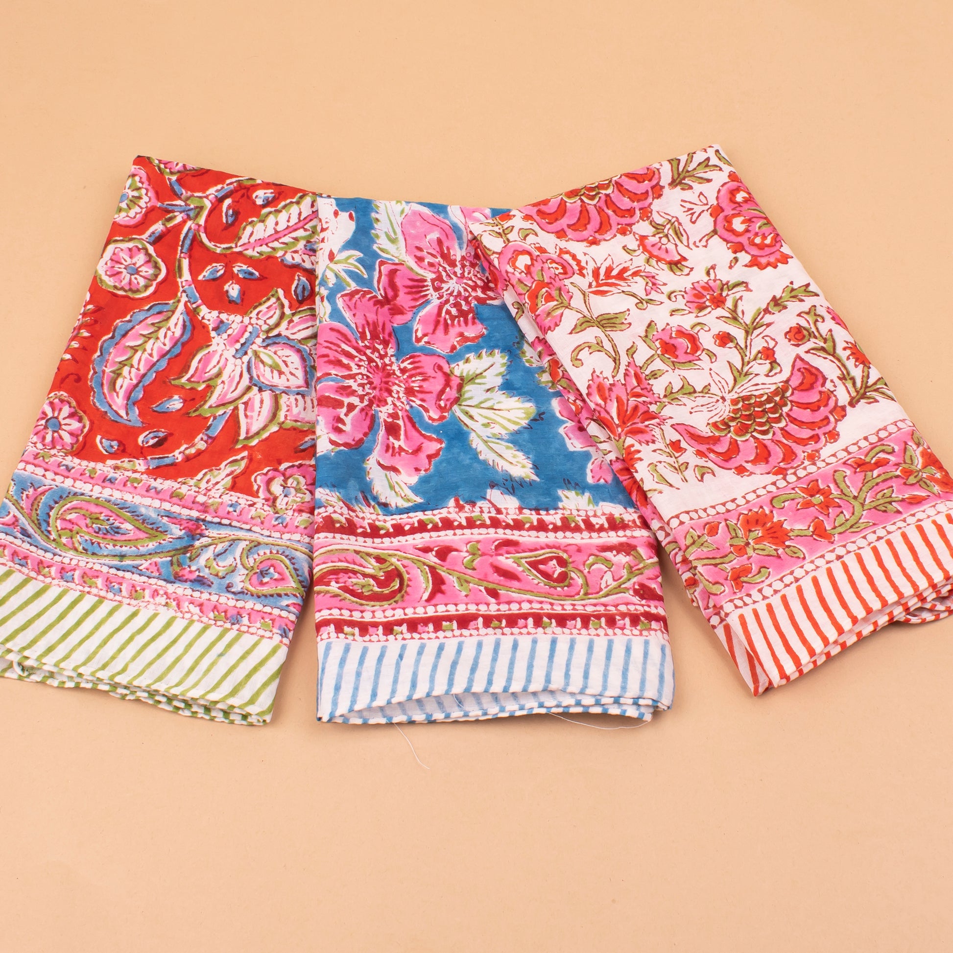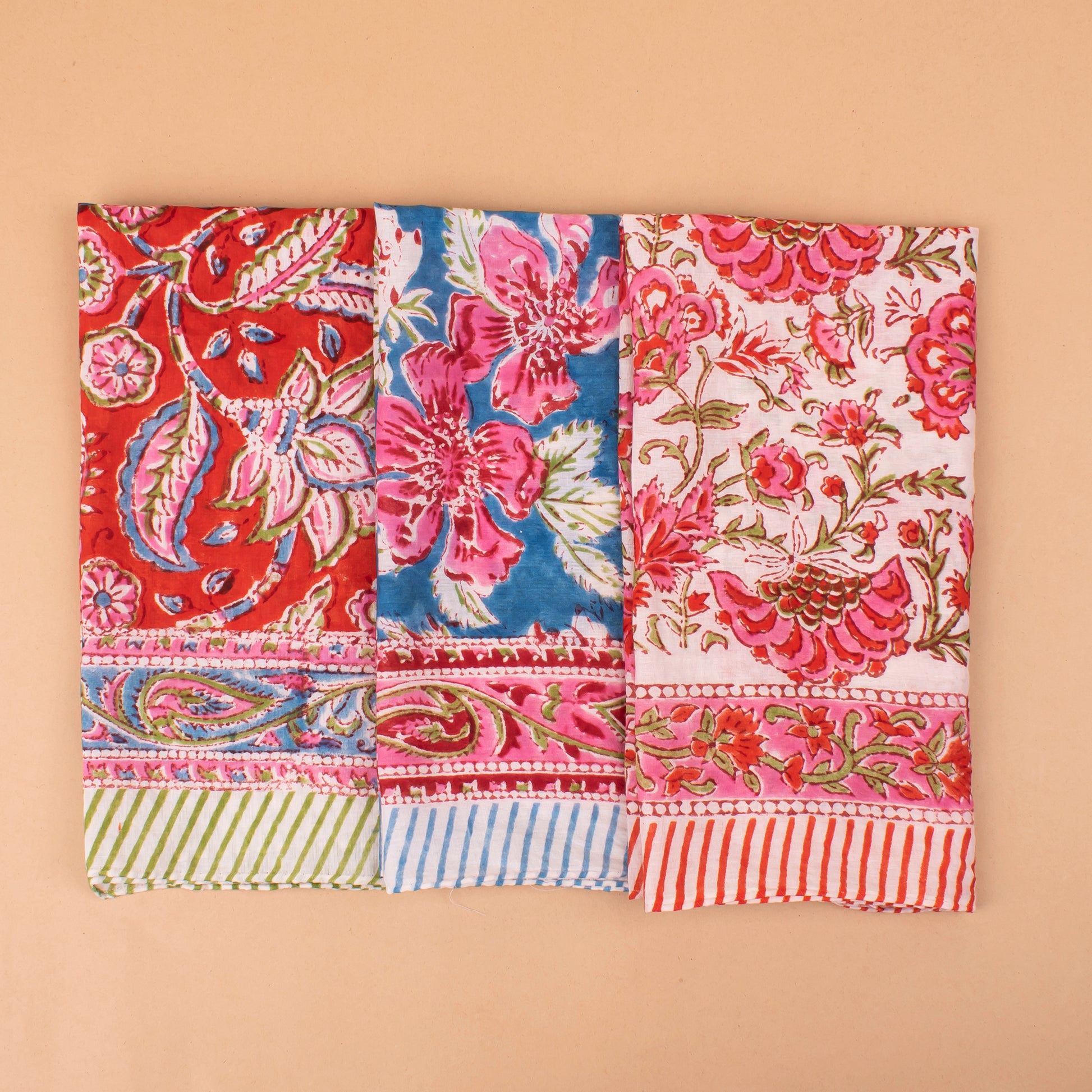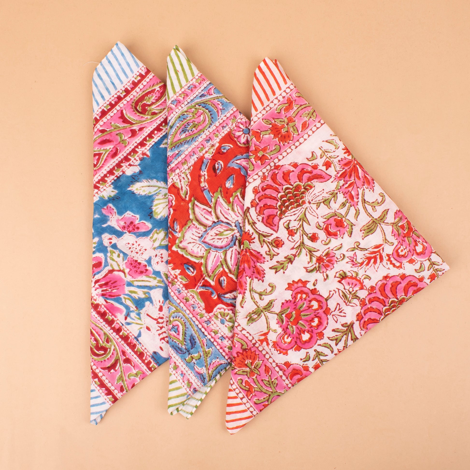 Set of 3 - Versatile Boho Cotton Bandanas For Bikers, Stylish Neck & Face Wraps, Handmade Block Printed Headwraps For Outdoors