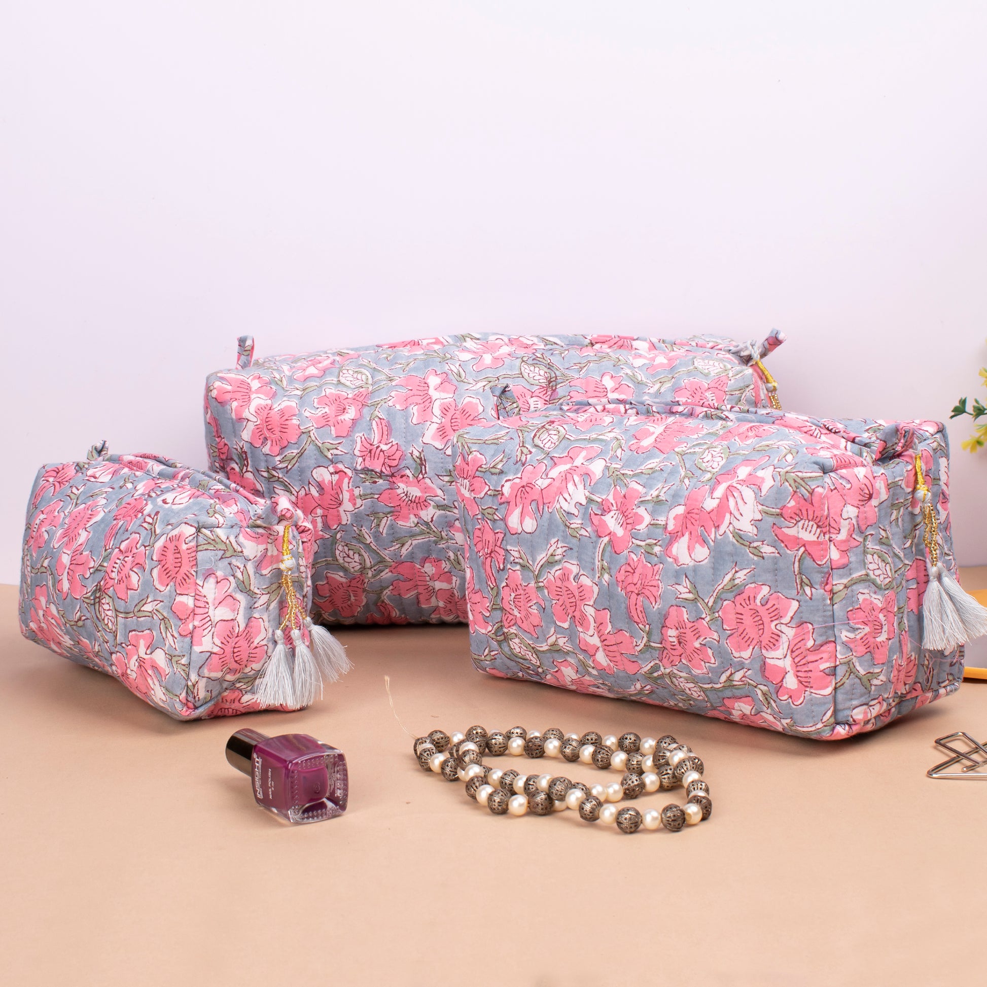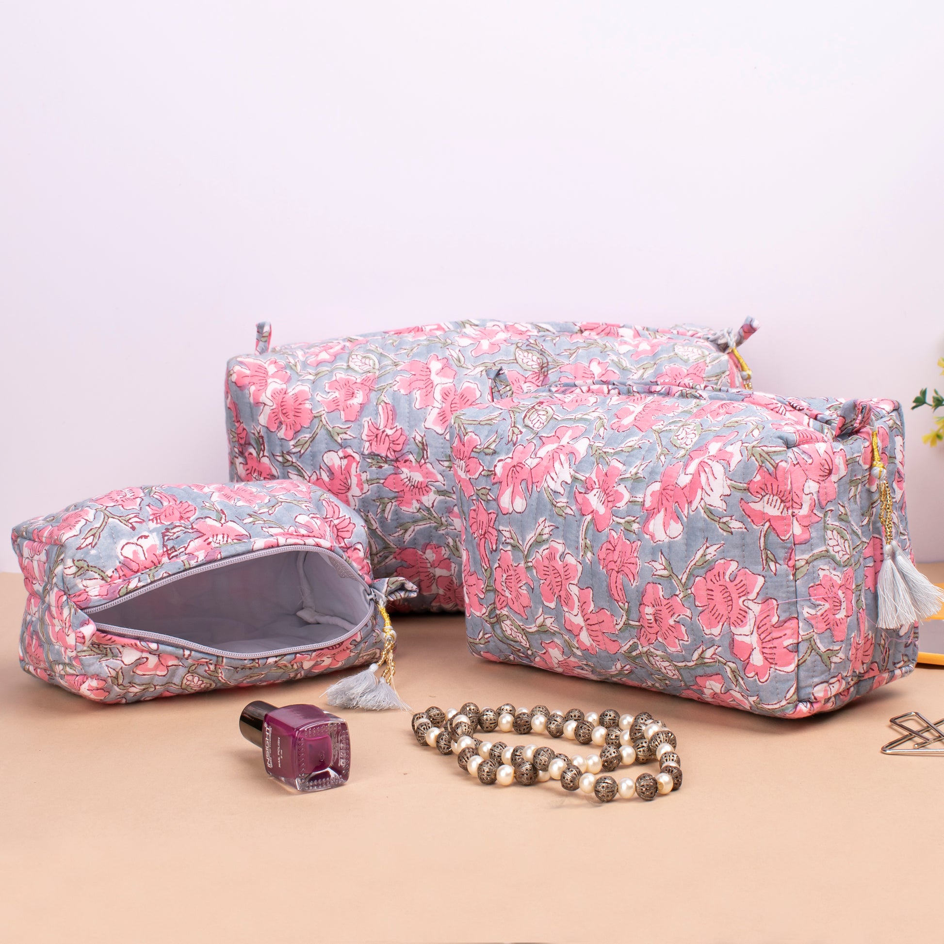 Washable Cosmetic Bags, Mini Makeup Organizer, Toiletry Bag 3 Pack Floral, Block Printing, Cute Makeup Organizer, Vanity Bag Makeup - Set of 3