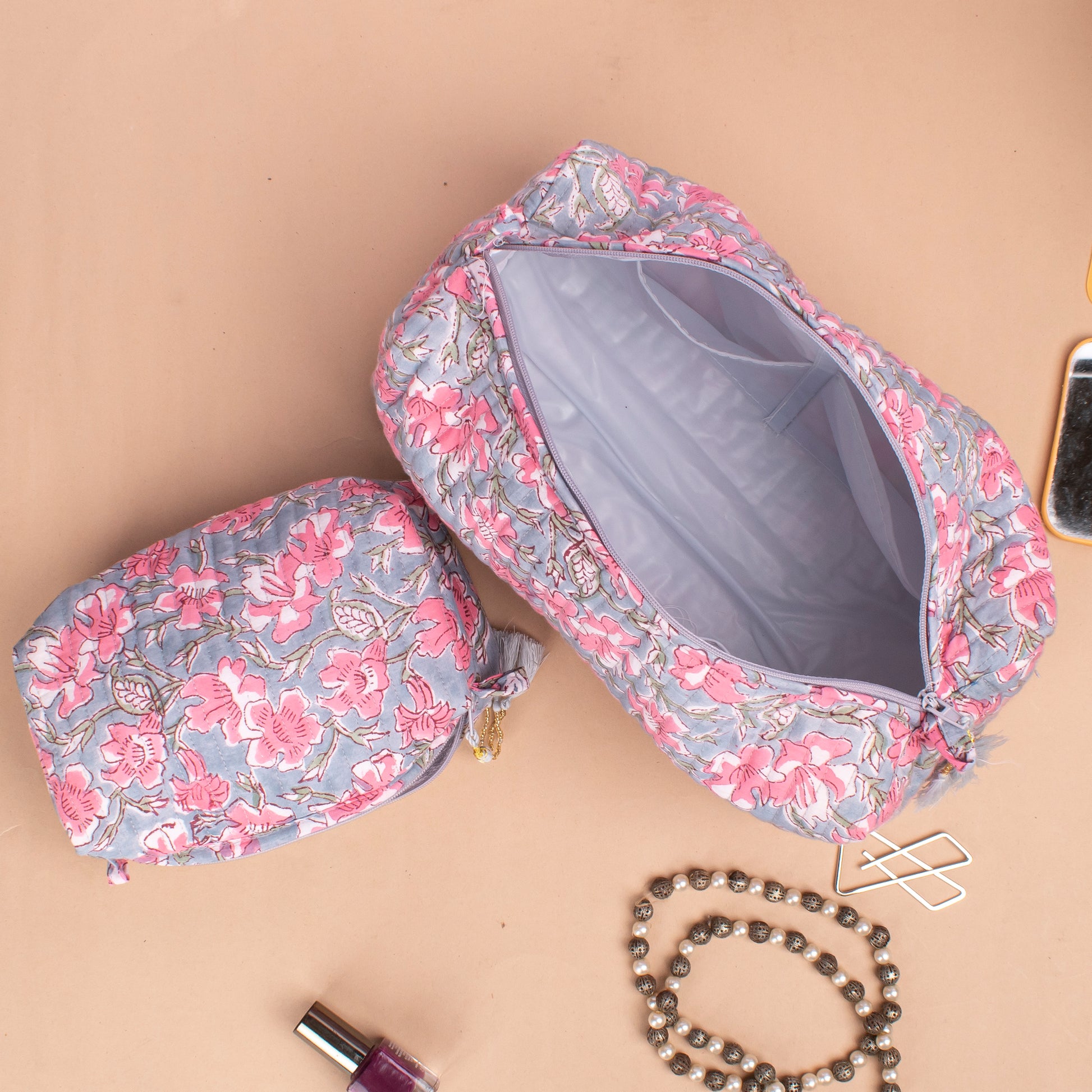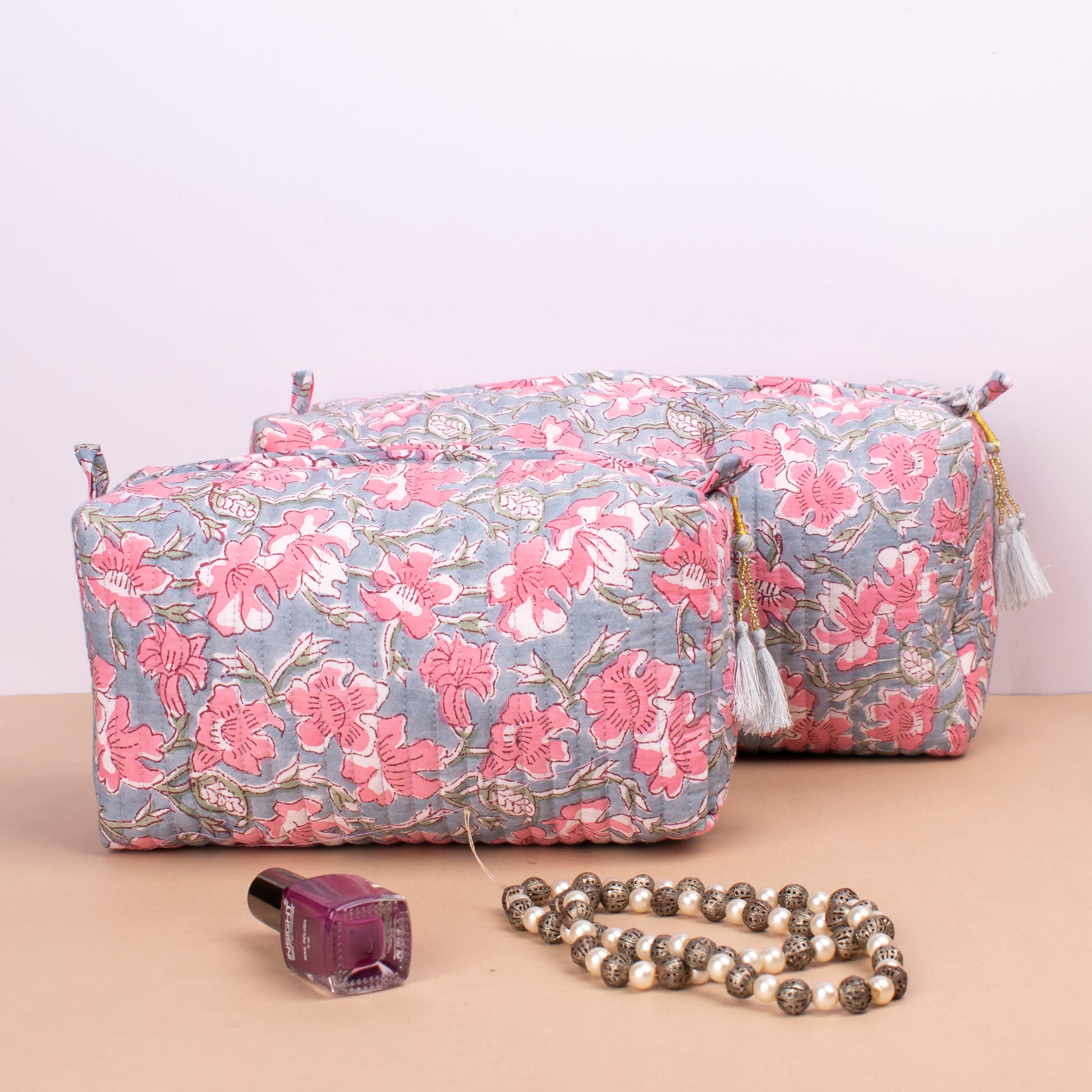 The hand block printed large toiletry bag is a delightful fusion of practicality and artistic flair. Crafted with meticulous attention to detail, each bag showcases a vibrant array of hand block printed designs, making it a unique and eye-catching accessory for your travels or daily routines.