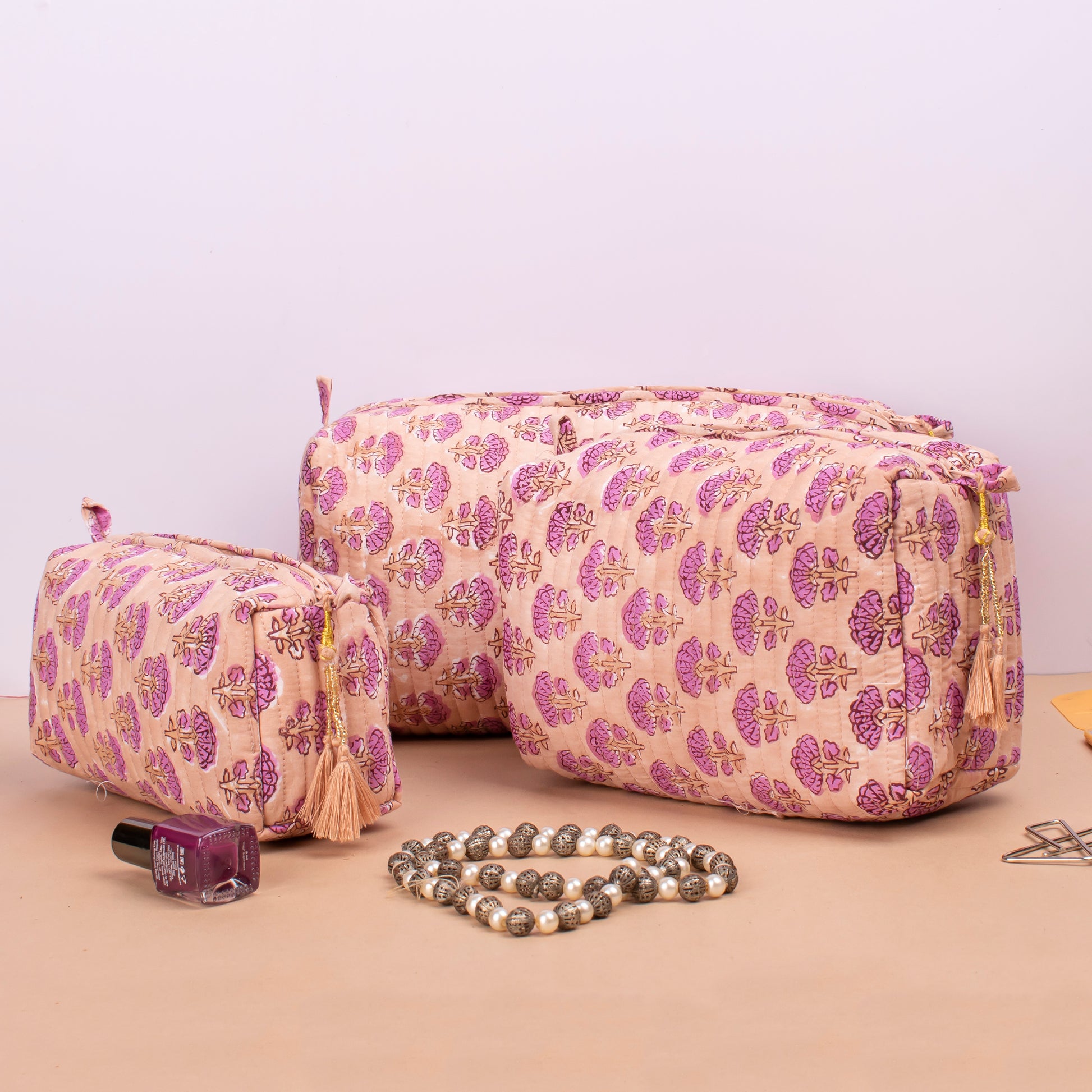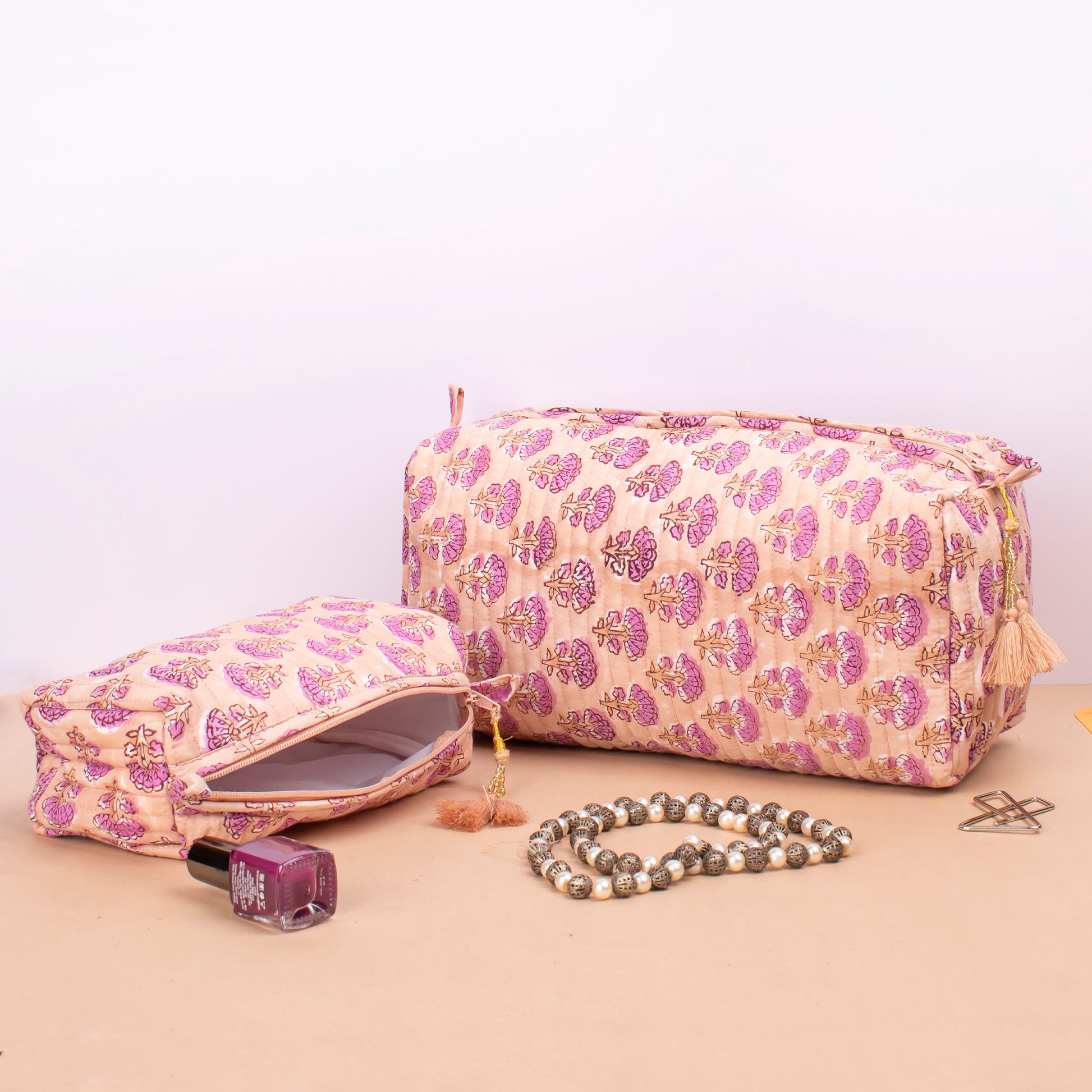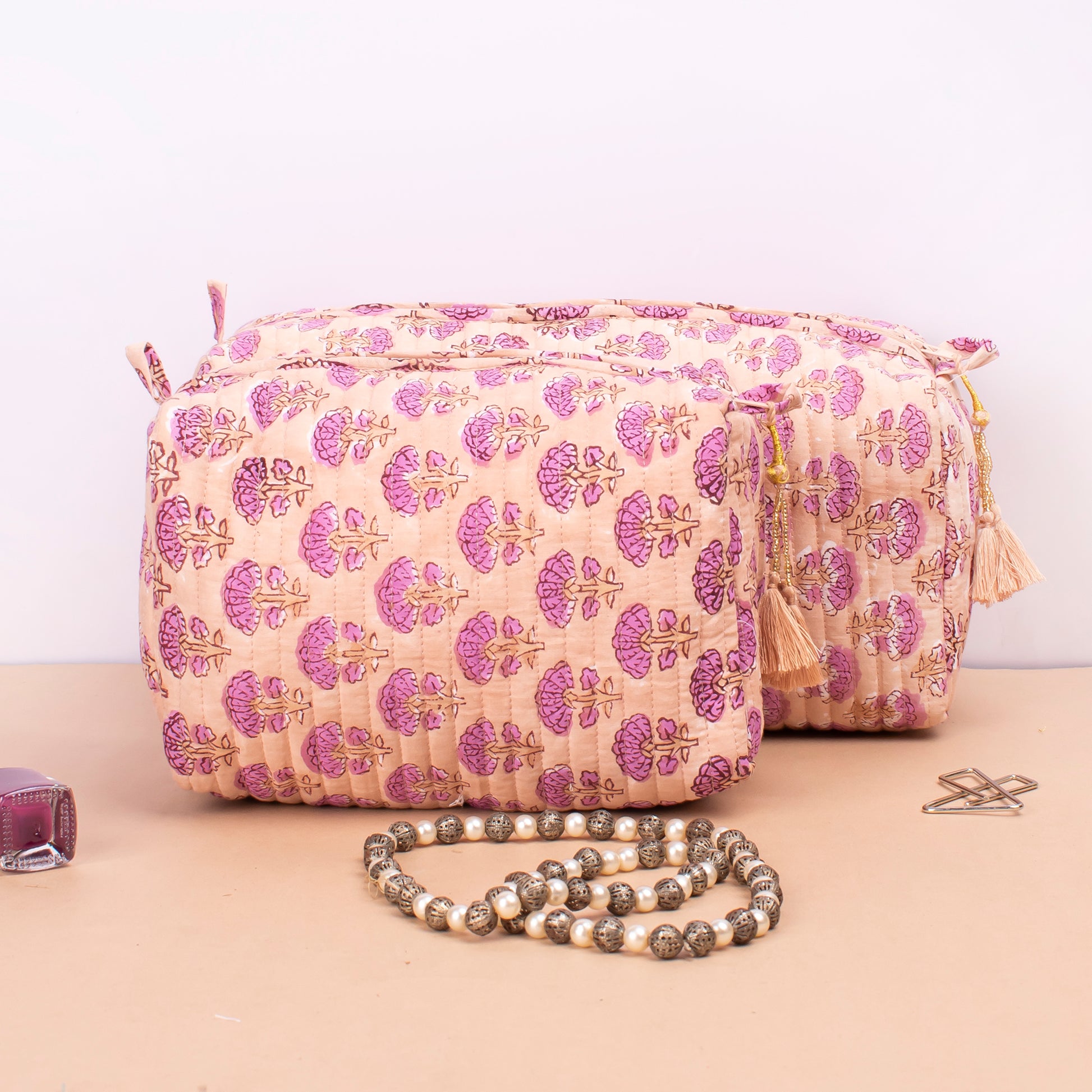 The hand block printed large toiletry bag is a delightful fusion of practicality and artistic flair. Crafted with meticulous attention to detail, each bag showcases a vibrant array of hand block printed designs, making it a unique and eye-catching accessory for your travels or daily routines.