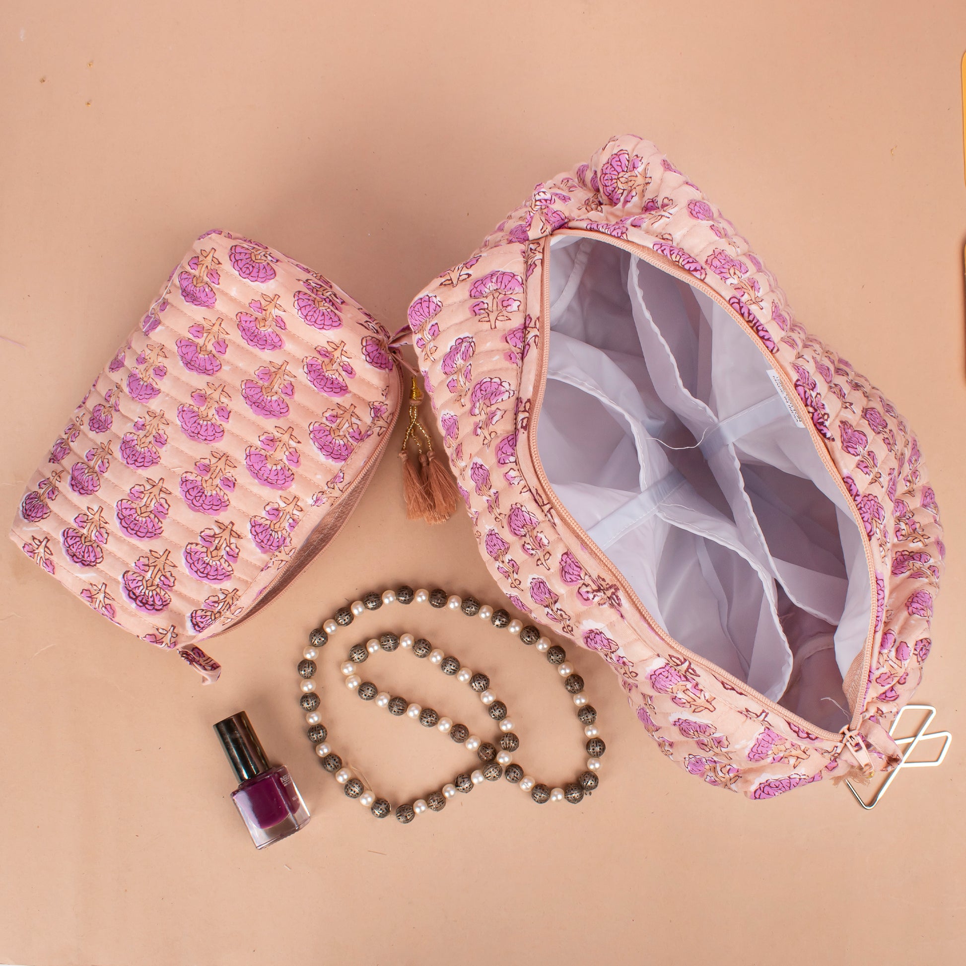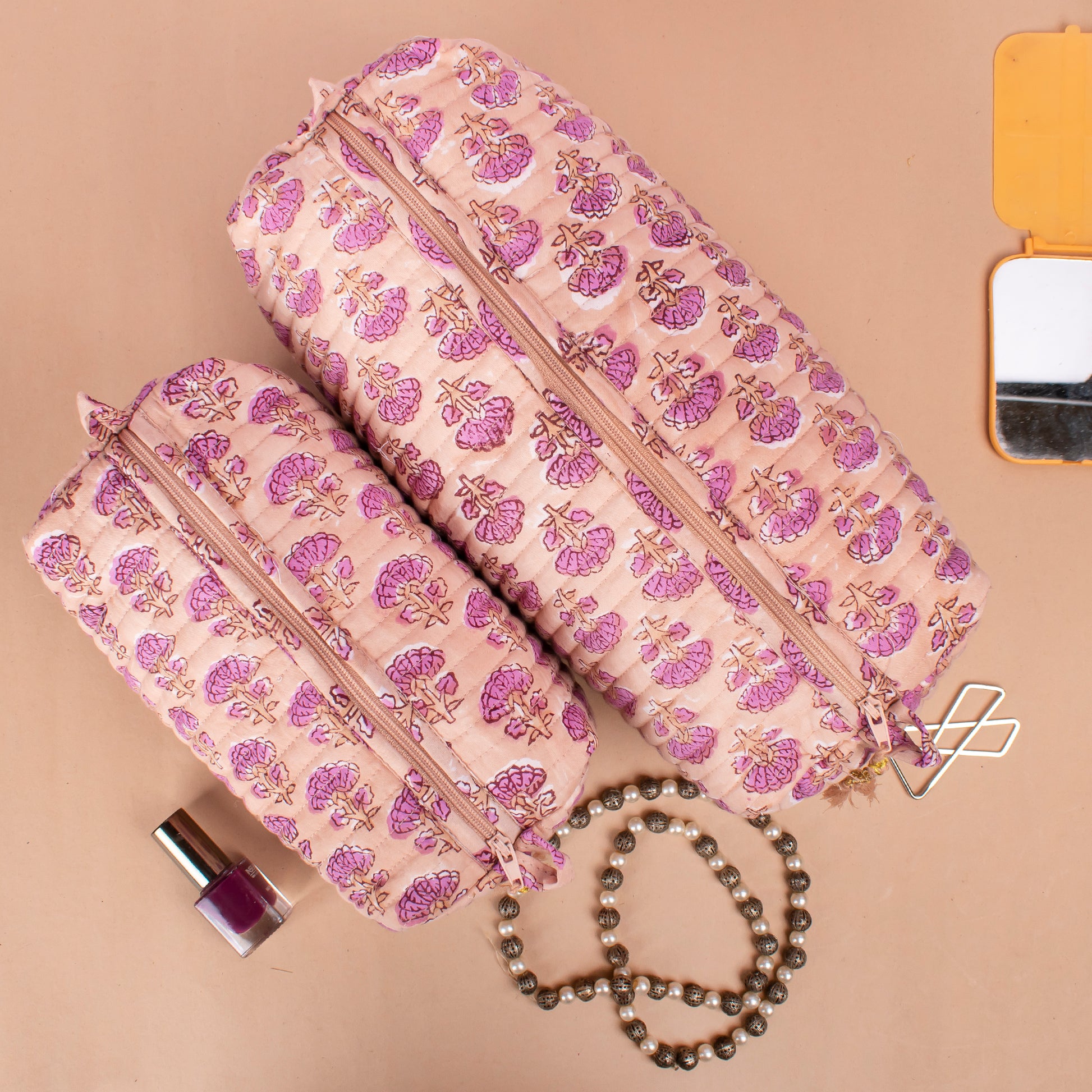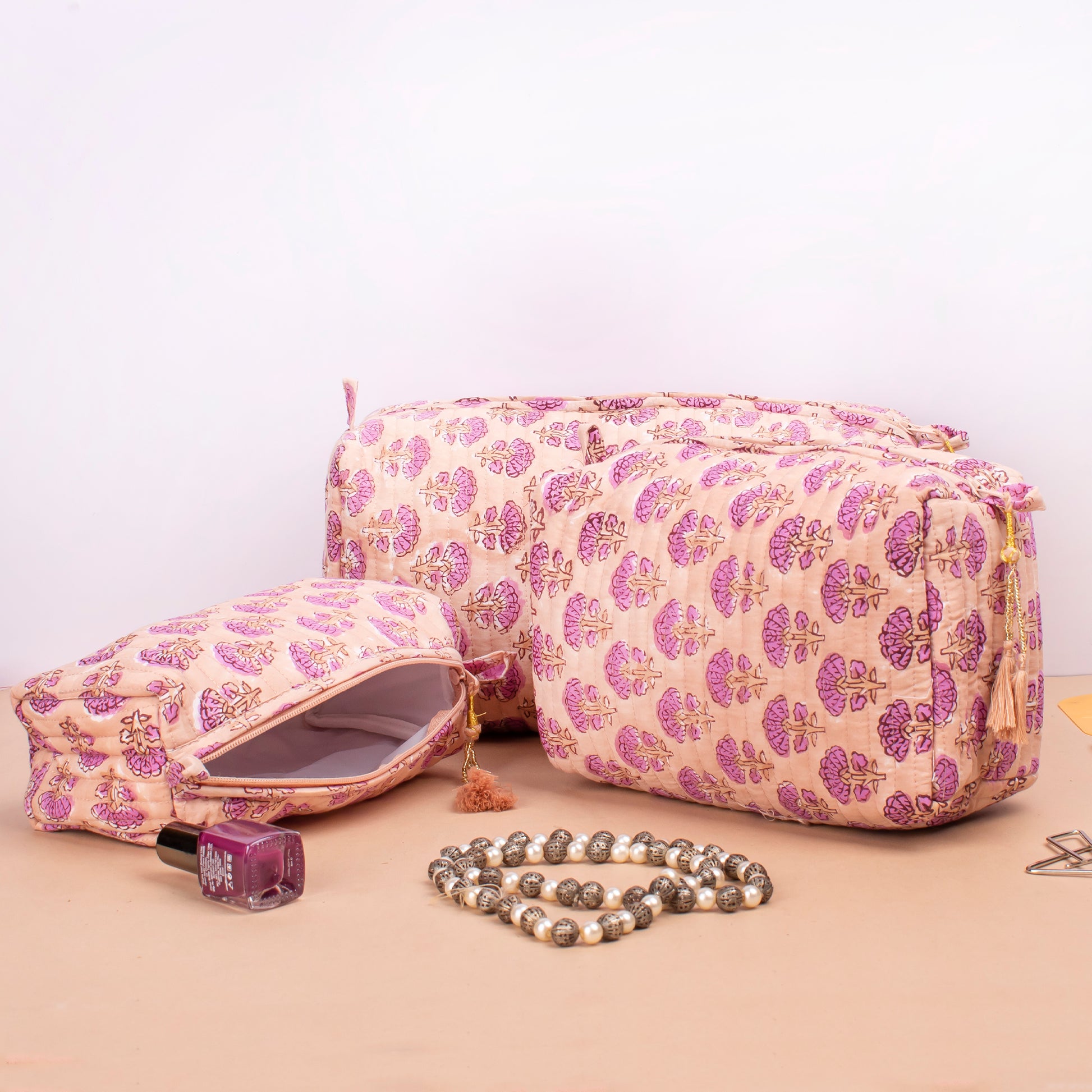 The hand block printed large toiletry bag is a delightful fusion of practicality and artistic flair. Crafted with meticulous attention to detail, each bag showcases a vibrant array of hand block printed designs, making it a unique and eye-catching accessory for your travels or daily routines.